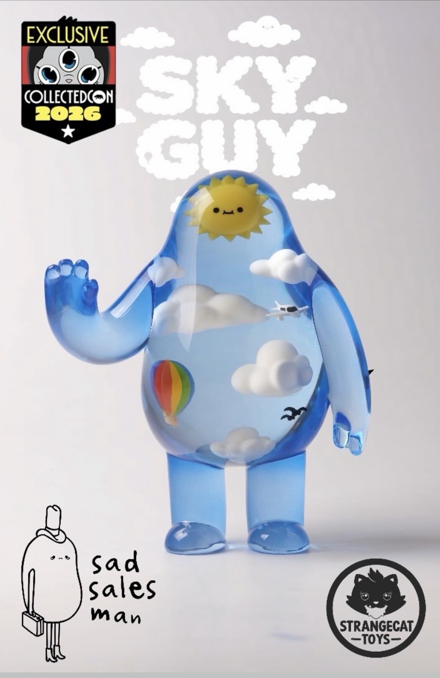 Sky Guy is a limited edition designer vinyl toy by sad salesman, produced exclusively for Collectedcon 2026 in partnership with Strangecat Toys. The figure features a translucent blue body encasing a detailed sky scene with a smiling yellow sun, fluffy white clouds, a small airplane, birds, and a rainbow hot air balloon. The piece was released exclusively at the Strangecat Toys booth at Collectedcon LA. Tickets and information were available at Collectedcon.com.