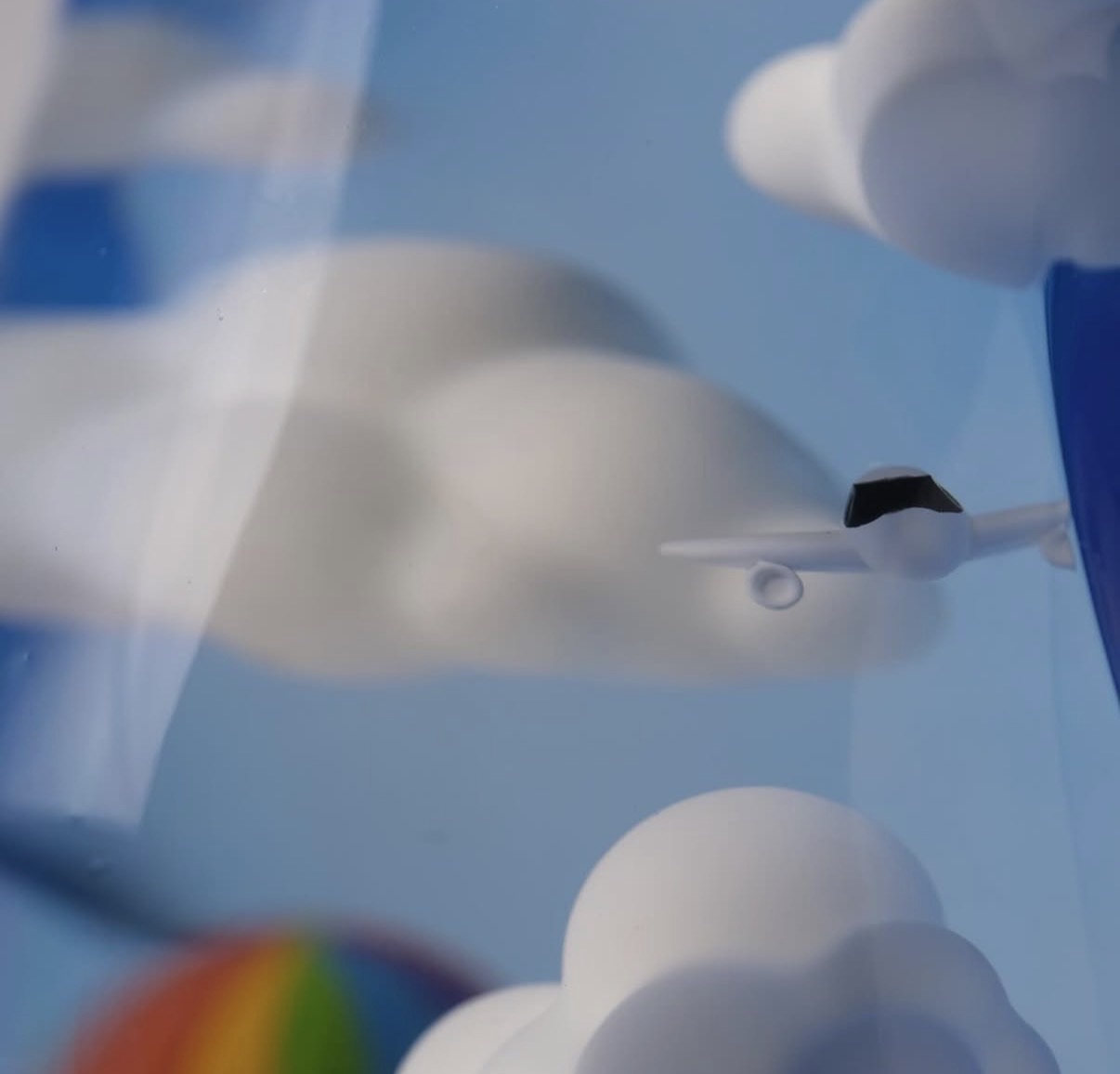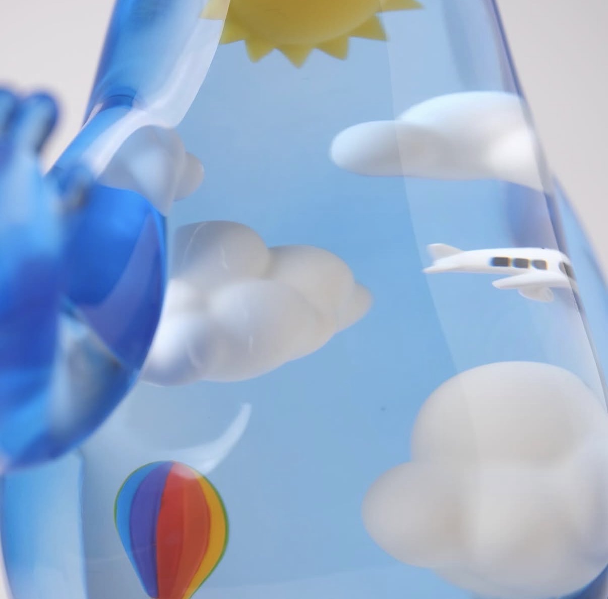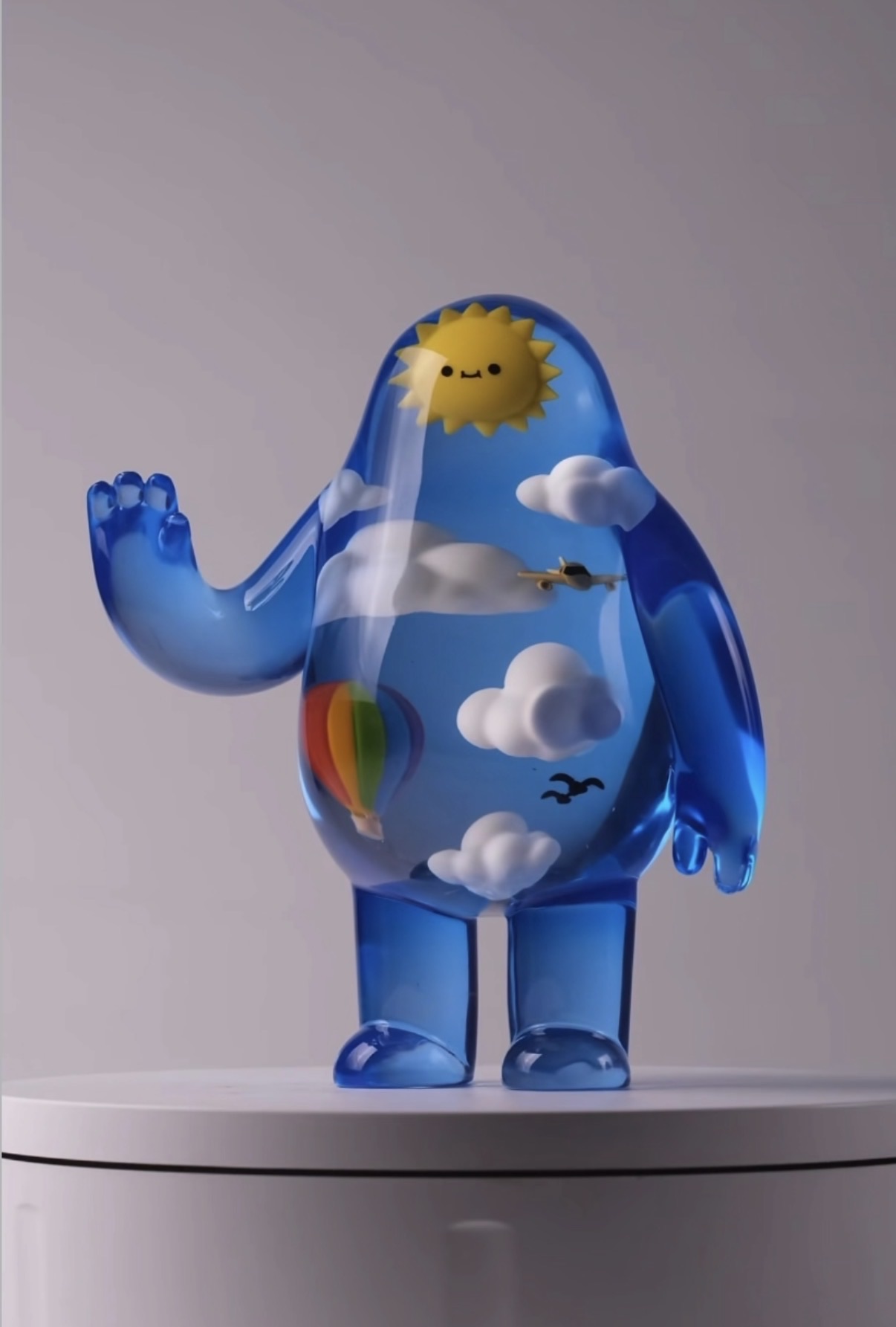 Jurevicius creates limited edition designer vinyl toys with translucent bodies and whimsical enclosed interior worlds, directly paralleling Sky Guy's translucent blue form housing a cheerful sky scene with playful characters and soft imagery.