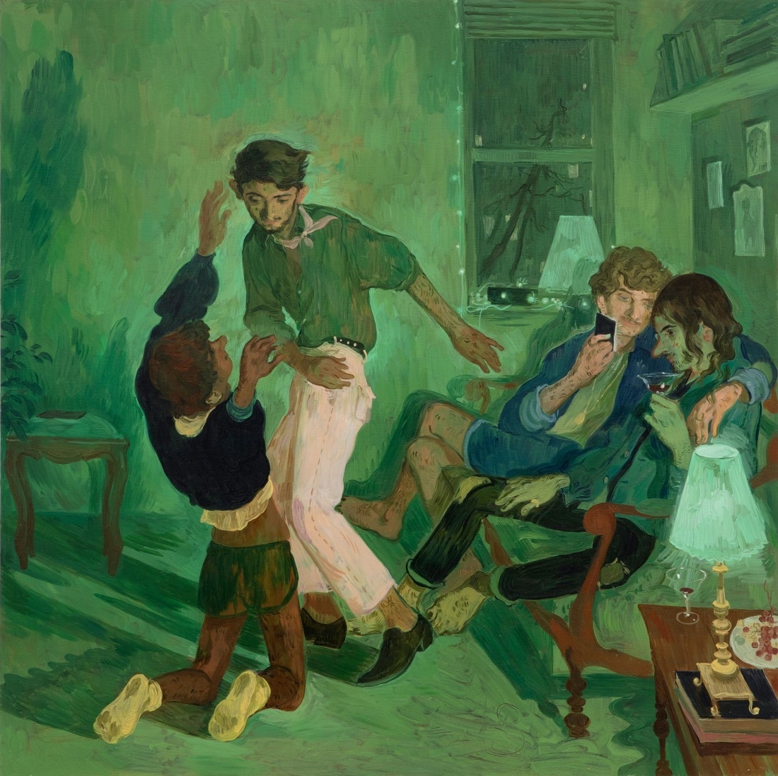 A richly atmospheric interior scene bathed in deep emerald greens, depicting four young men in a domestic setting — two engaged in a playful physical interaction while two others recline together, one scrolling a phone and the other sipping a cocktail by lamplight. Salman Toor's distinctive figurative style merges Old Master compositional ambition with a contemporary queer sensibility, evoking intimacy, youth, and social life. The warm glow of table lamps and fairy lights punctuates the cool green palette, lending the scene a theatrical, nocturnal mood. A significant work from Toor's celebrated 2019 period, now in a named private collection.