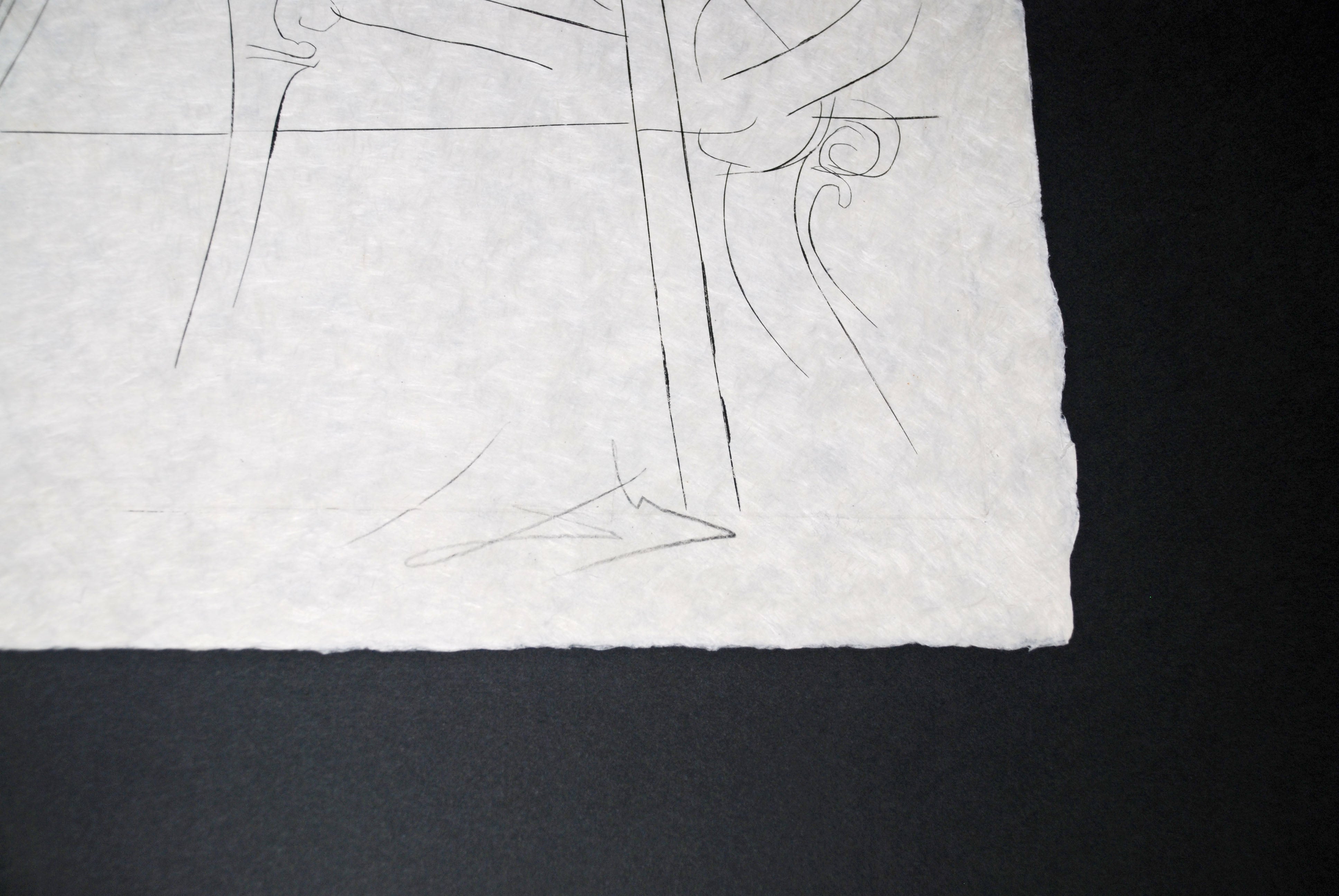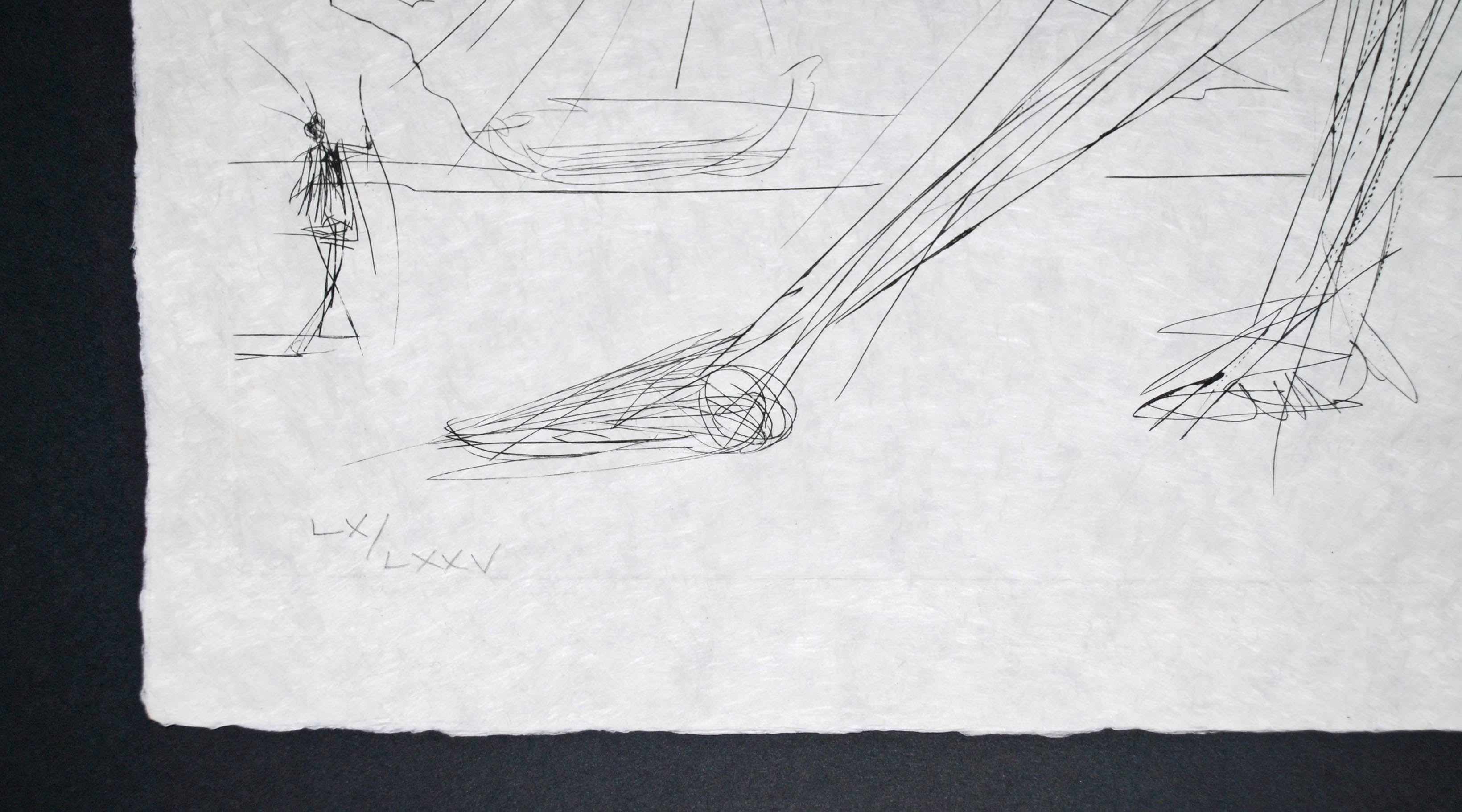 This extraordinary lithograph with collage presents Dali's visionary exploration of functional design reimagined through his characteristic surrealist lens. The "Breathing Pneumatic Armchair" emerges as a fantastical object suspended between utility and pure imagination, rendered with the technical precision and dreamlike quality that defined Dali's later work. Created in 1975 as part of his "Imaginations and Objects of the Future" portfolio, the composition captures an inflatable chair that seems to possess an almost organic, living quality, as if it might expand and contract with breath or sentiment. The lithographic process, enhanced with collage elements on delicate Japon paper, creates rich tonal variations and a luminous surface quality that draws the viewer into Dali's speculative vision of how everyday objects might evolve in an idealized future. This work exemplifies Dali's continued fascination with the relationship between form, function, and fantasy during a period when he was increasingly engaged with furniture design and applied arts. The limited edition of seventy-five impressions underscores the print's exclusivity, while the substantial framed dimensions (40 by 37 inches) provide the work with commanding presence on any wall. For collectors seeking a significant example of Dali's later graphic production that bridges the artist's surrealist philosophy with industrial design concepts, this breathing armchair represents both a thoughtful investment and a conversation piece that embodies the visionary optimism characteristic of seventies modernism.
