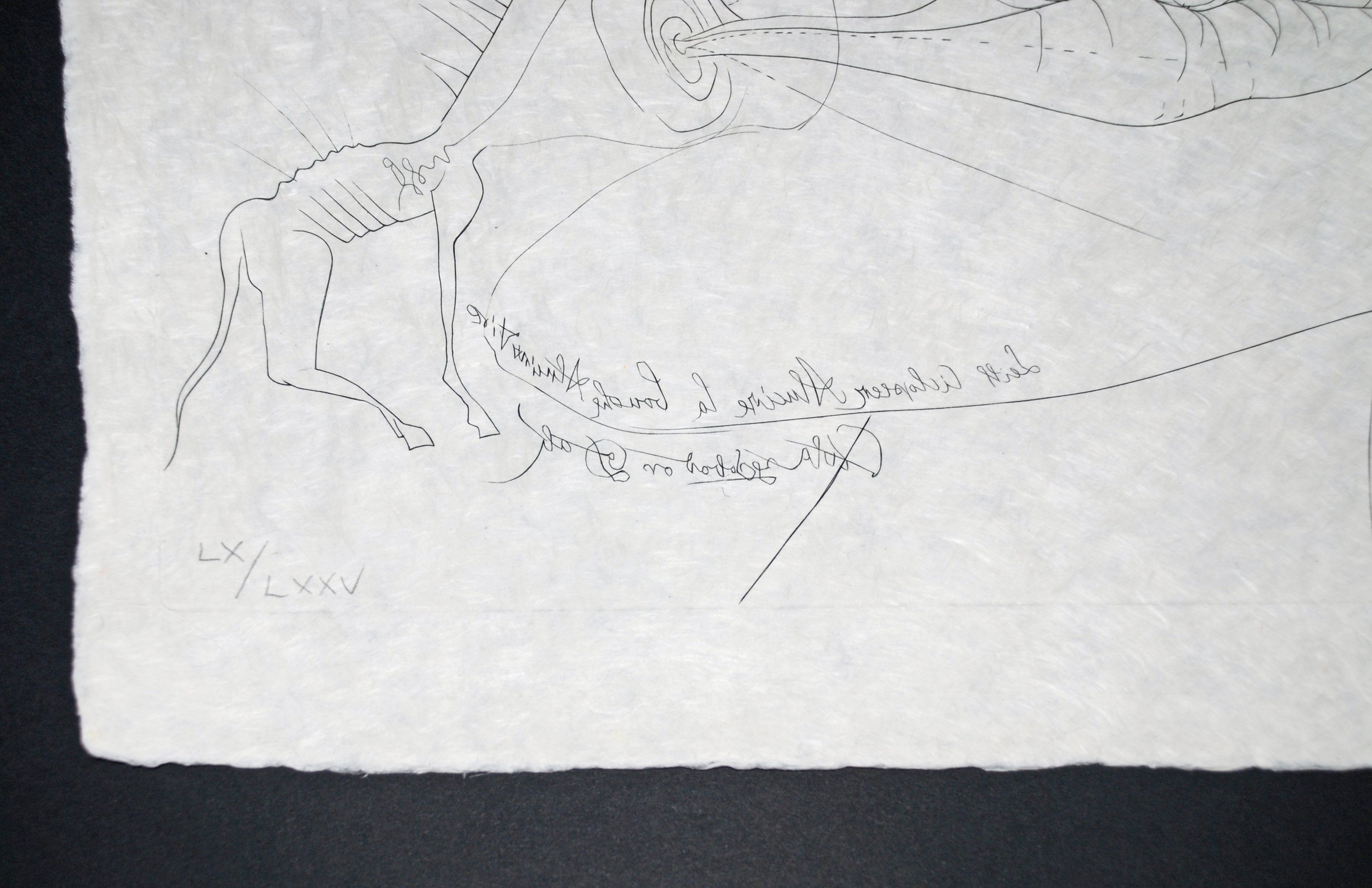 This striking lithograph with collage embodies Dali's visionary exploration of technology and perception during the mid-1970s. Created as part of his ambitious "Imaginations and Objects of the Future" portfolio, the work combines the artist's distinctive surrealist vocabulary with his prescient fascination with television and electronic media. The composition merges organic forms with geometric abstraction, creating a dreamlike visualization of how future technologies might dissolve the boundaries between solid matter and immaterial broadcast. Executed in lithography with collage elements on delicate Japon paper, the print demonstrates Dali's masterful control of the medium while maintaining the spontaneous, visionary quality characteristic of his later work. This is edition LX of LXXV, a relatively intimate edition size that underscores the work's significance as a limited artistic statement. The print remains a compelling artifact of its historical moment, capturing a pre-digital era's speculation about how electronic communication would transform human consciousness and experience. Collectors drawn to Dali's engagement with technology, his conceptual audacity, and the technical virtuosity of fine art printmaking will find this work a substantial addition to their holdings. The combination of signed authentication, museum-quality framing, and the work's thematic resonance with contemporary discussions about media and perception ensures its enduring relevance and appeal.