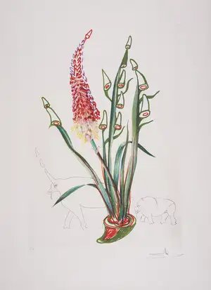 This 1972 etching and heliogravure by Salvador Dalí depicts the Kniphofia aphrodisiaca flower rendered in characteristically surrealist fashion, transforming the botanical subject into a dreamlike and abstracted form. Part of his Surrealistic Flowers series, the work exemplifies Dalí's approach of infusing nature with psychological and erotic symbolism through distorted forms and rich color. Printed on Arches paper as an artist's proof, this striking composition measures approximately 754 by 559 millimeters and bears Dalí's authentication marks alongside the printer's mark from the prestigious Parisian workshops of Ateliers Rigal and Draeger.