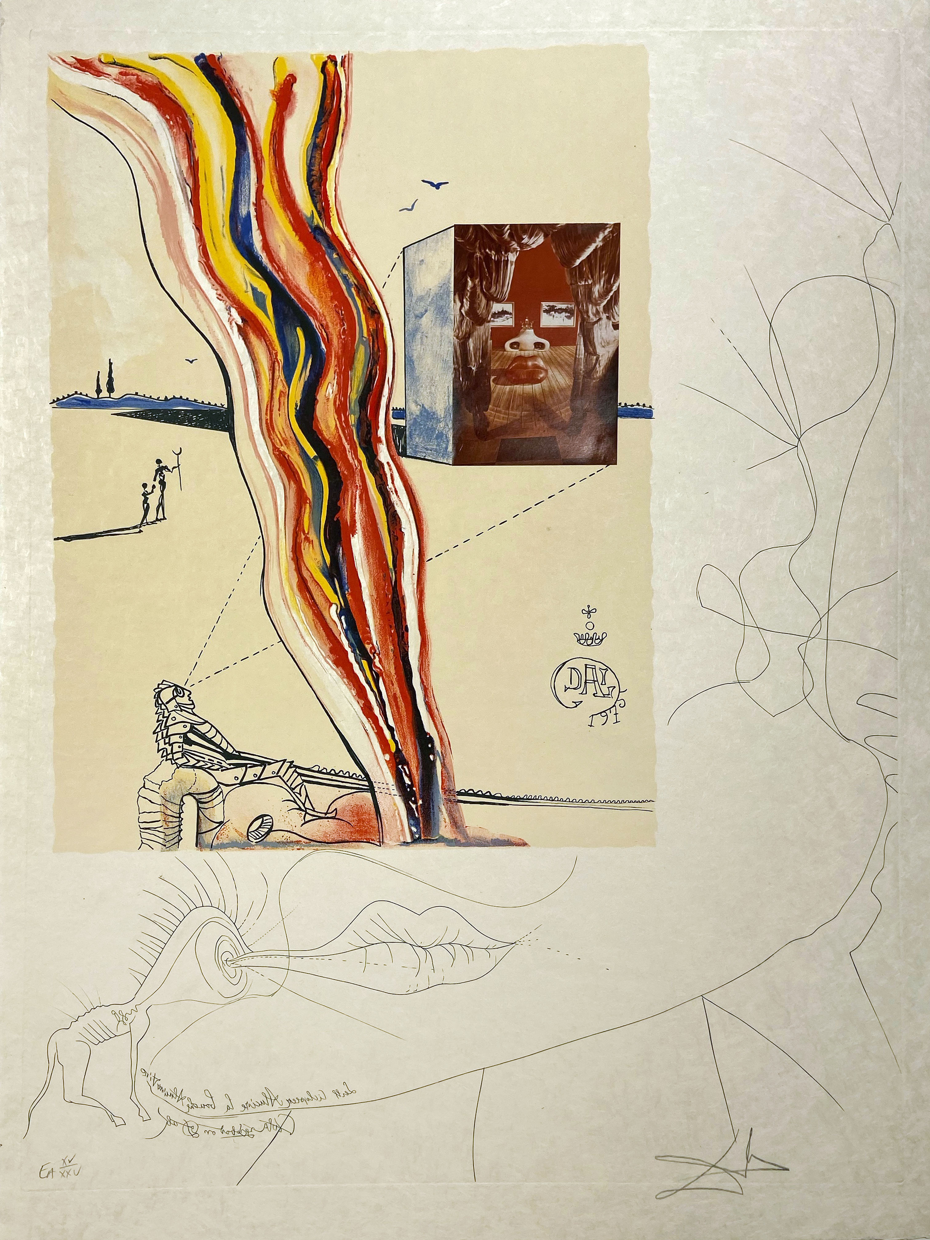 This 1975 lithograph exemplifies Dalí's late-career fascination with technology and media, depicting his characteristic melting forms applied to television sets in vivid color. The work demonstrates his masterful command of lithographic technique on fine Japon paper, blending his signature surrealist imagery with contemporary concerns about mass communication and the fluidity of modern media.