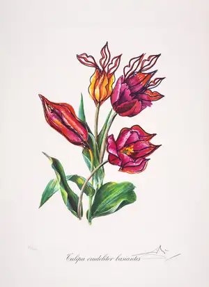 This 1972 color etching and heliogravure by Salvador Dalí exemplifies the Surrealist master's exploration of botanical imagery rendered through his characteristic dreamlike distortions and technical virtuosity. Created in an edition of 350 and printed by the prestigious Parisian firms Ateliers Rigal and Draeger, the work demonstrates Dalí's continued engagement with printmaking and his ability to transform a simple tulip into a vehicle for psychological and sensual expression. The title, suggesting cruel kissing, hints at the erotically charged and darkly poetic content that typifies Dalí's mature work.
