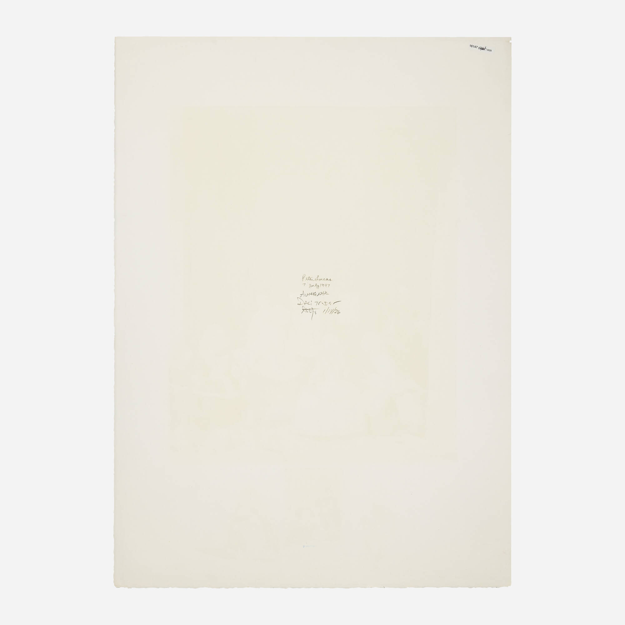 Dalí's interpretation of Velazquez's Las Meninas comes from his Changes in Great Masterpieces portfolio and represents his surrealist approach to one of art history's most significant compositions. Executed as an offset lithograph on Rives paper in 1974, the work demonstrates Dalí's obsessive engagement with this masterpiece throughout his career. The print transforms Velazquez's spatial complexity and psychological depth into Dalí's signature dreamlike imagery and distorted perspectives. Dalí's multiple meditations on this painting reflect his belief in the creative potential of reinterpreting canonical works. The lithograph captures both reverence for the original and complete formal reimagining.