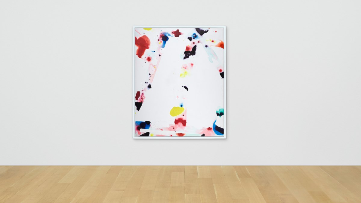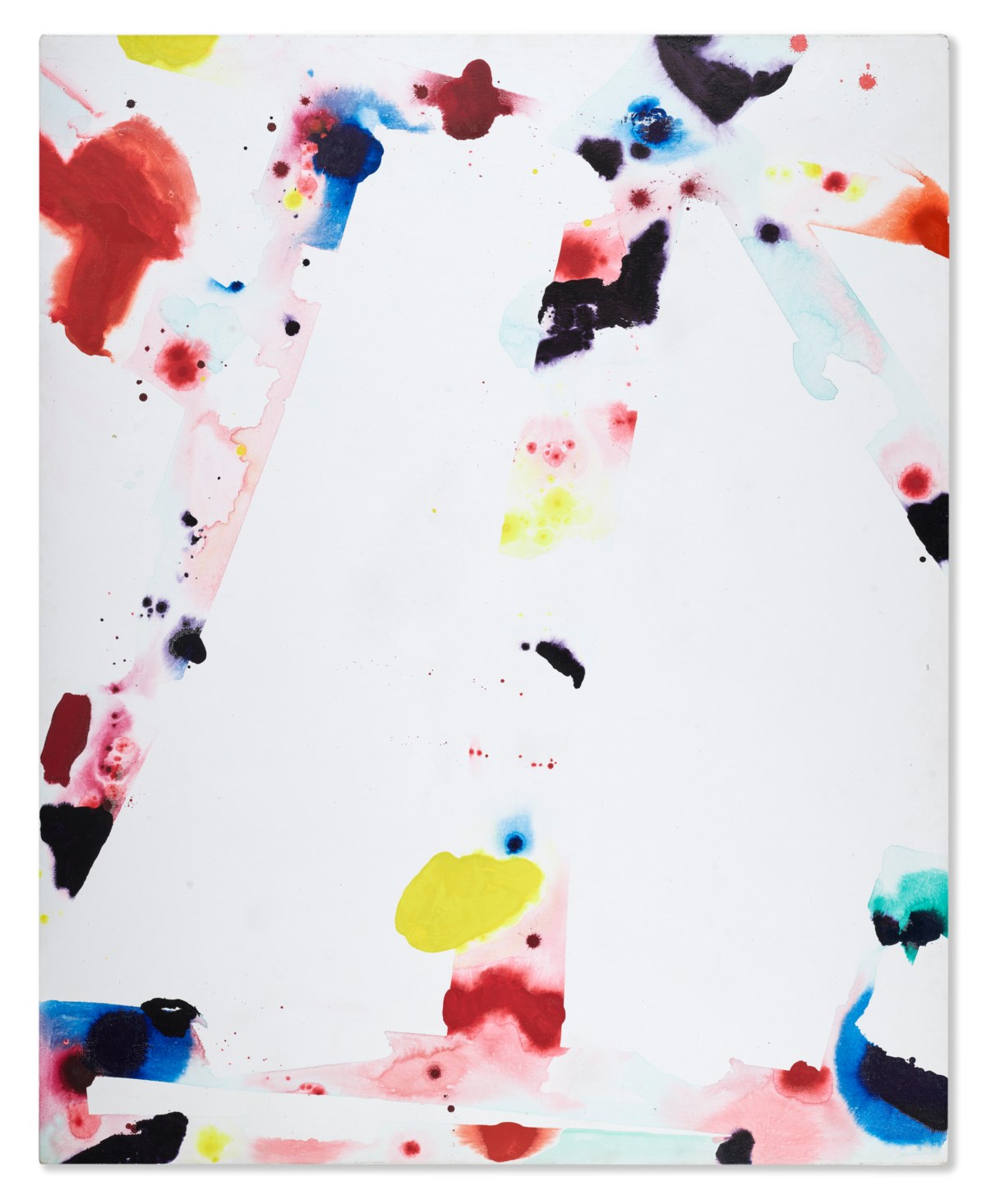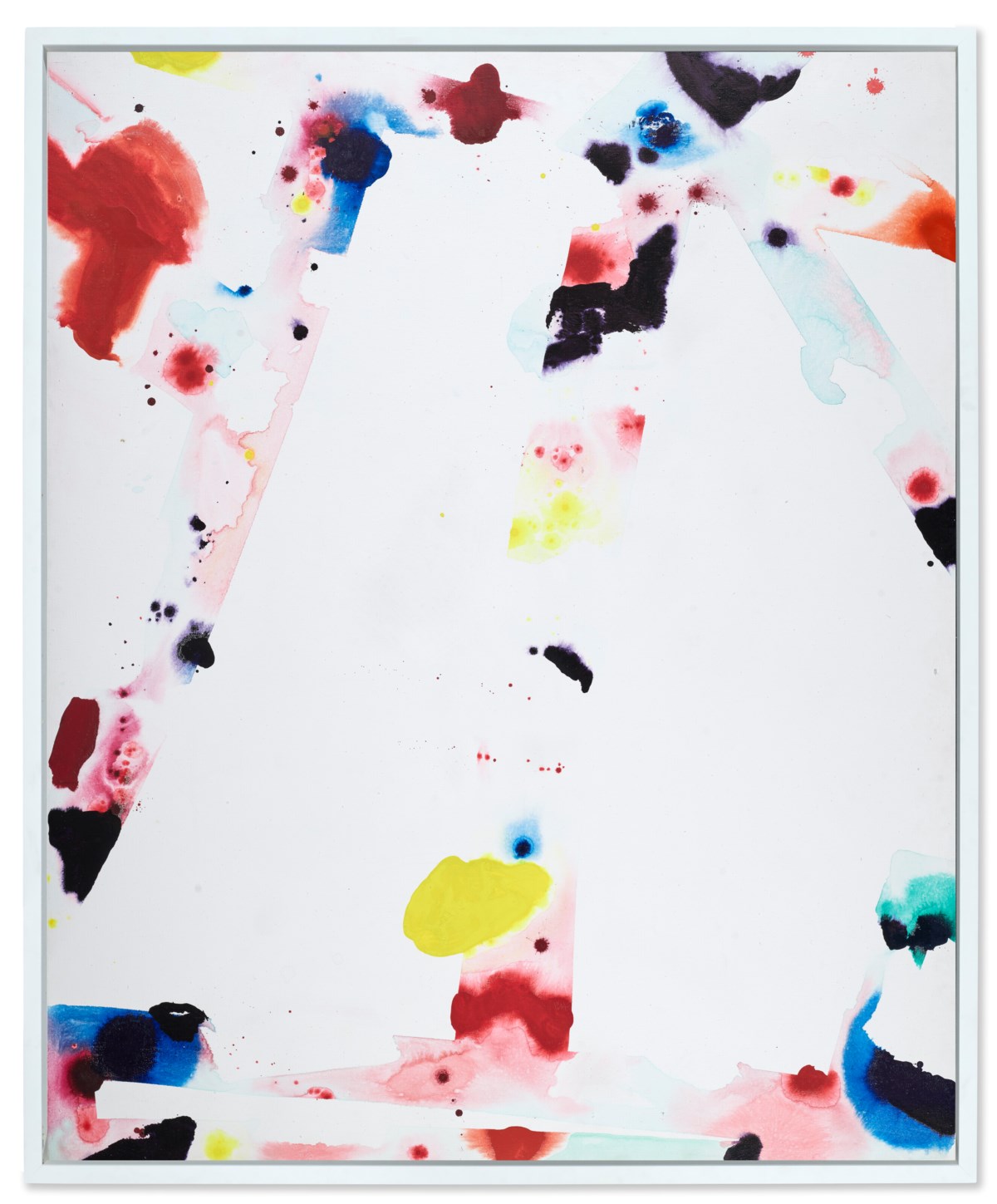 A vibrant explosion of gestural marks and bold color characterizes this untitled acrylic work by American Abstract Expressionist Sam Francis. Dynamic splashes and drips of vivid hues burst across the canvas, reflecting Francis's signature style of luminous, energetic abstraction. The composition balances spontaneity with spatial awareness, drawing the eye across fields of color that pulse with movement and light.