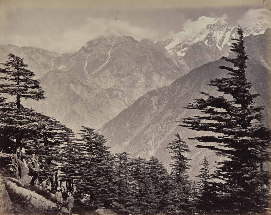 High-altitude photography challenges are overcome in Bourne's breathtaking capture of Himalayan peaks, with deodar trees providing dramatic foreground scale against China's distant mountains.