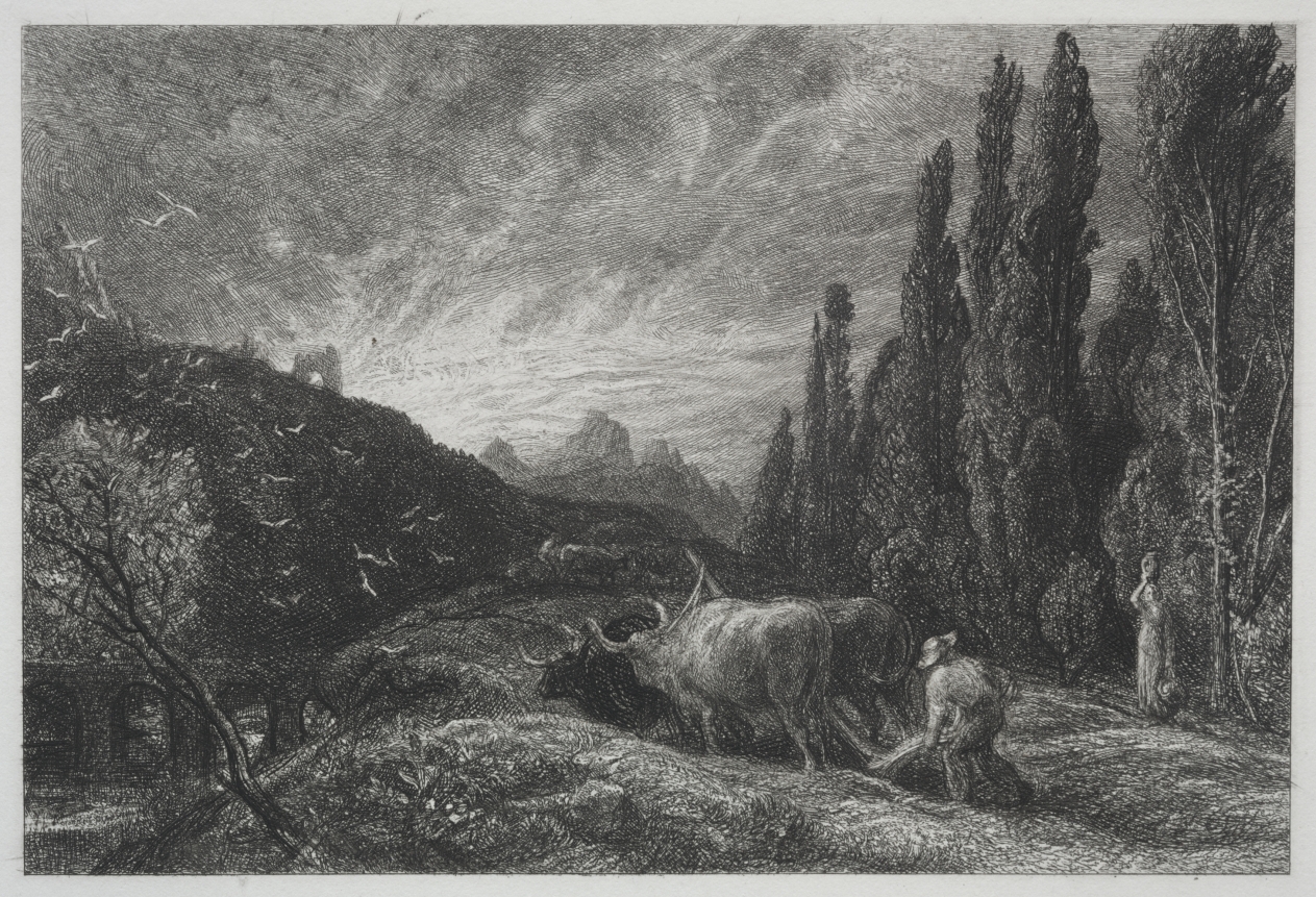 Dawn light and agricultural labor unite in this etching that exemplifies Palmer's romantic vision of rural England, where human toil harmonizes with nature's rhythms and divine purpose.
