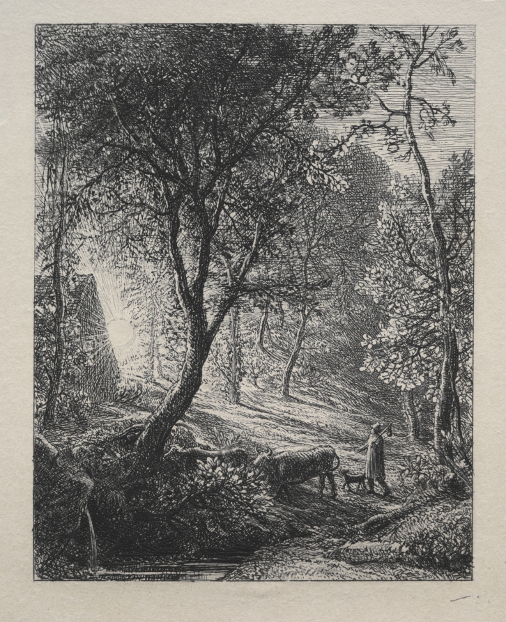 Intimate scale and meticulous detail characterize this rural scene, where Palmer's etching technique creates a sense of rustic simplicity that embodies his romantic idealization of country life.
