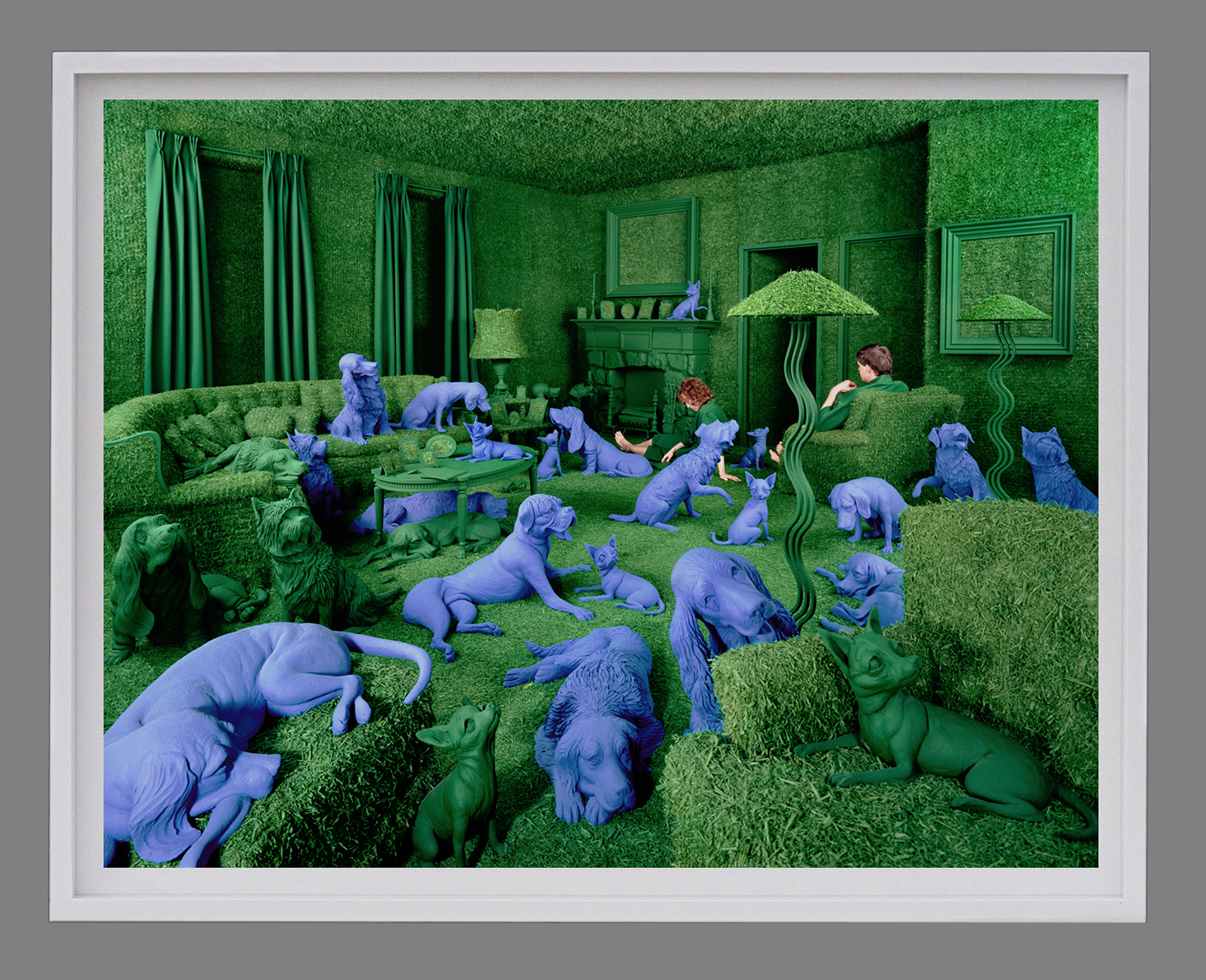 Sandy Skoglund's 1990 work combines photography and sculpture, presenting 'The Green House' and 'Moody Calm' as interconnected pieces. This multimedia installation exemplifies Skoglund's distinctive approach to creating immersive, color-saturated environments.