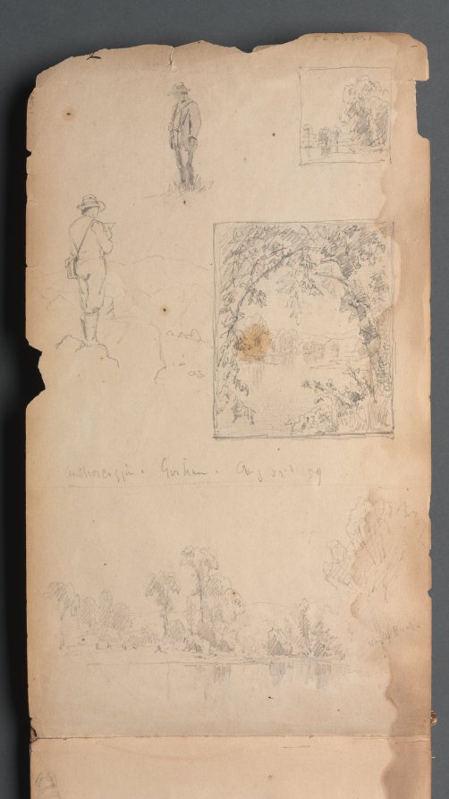 This graphite sketchbook page showcases Gifford's exploratory approach to figure drawing through multiple self portrait studies arranged with surrounding vignettes. The sketches demonstrate the 19th century Hudson River School artist's technical facility with the medium and his interest in capturing varied expressions and angles of the human face. The compositional arrangement, with the portraits embedded within decorative or narrative vignettes, reflects the artist's practice of using sketchbook pages as spaces for both portraiture study and imaginative visual experimentation.