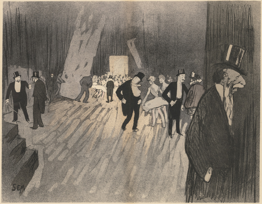 Hand-colored with delicate watercolor washes, this lithograph offers an intimate glimpse behind the scenes of Parisian theatrical life during the Belle Époque.