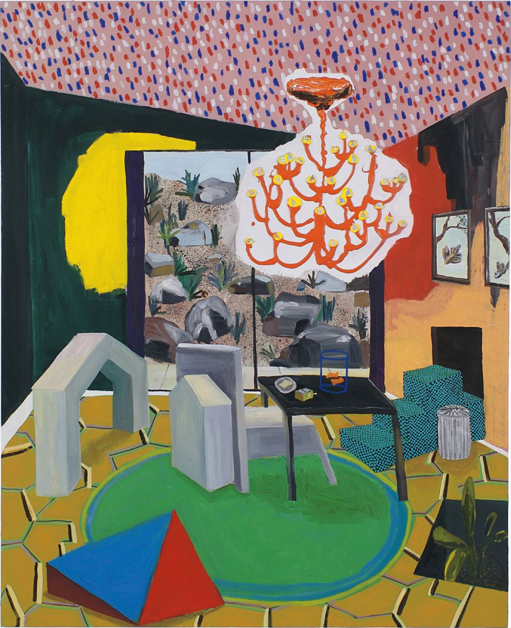 In *Enter Goldfish*, Shara Hughes constructs a vivid, dreamlike interior landscape bursting with bold, gestural marks and an electric palette of tropical hues. Swirling botanical forms and undulating patterns fill the composition, blurring the boundary between natural environment and imaginative space. Hughes layers oil, acrylic, enamel, paint pens, and plastic paper to build a richly textured surface that pulses with energetic, almost theatrical vitality.