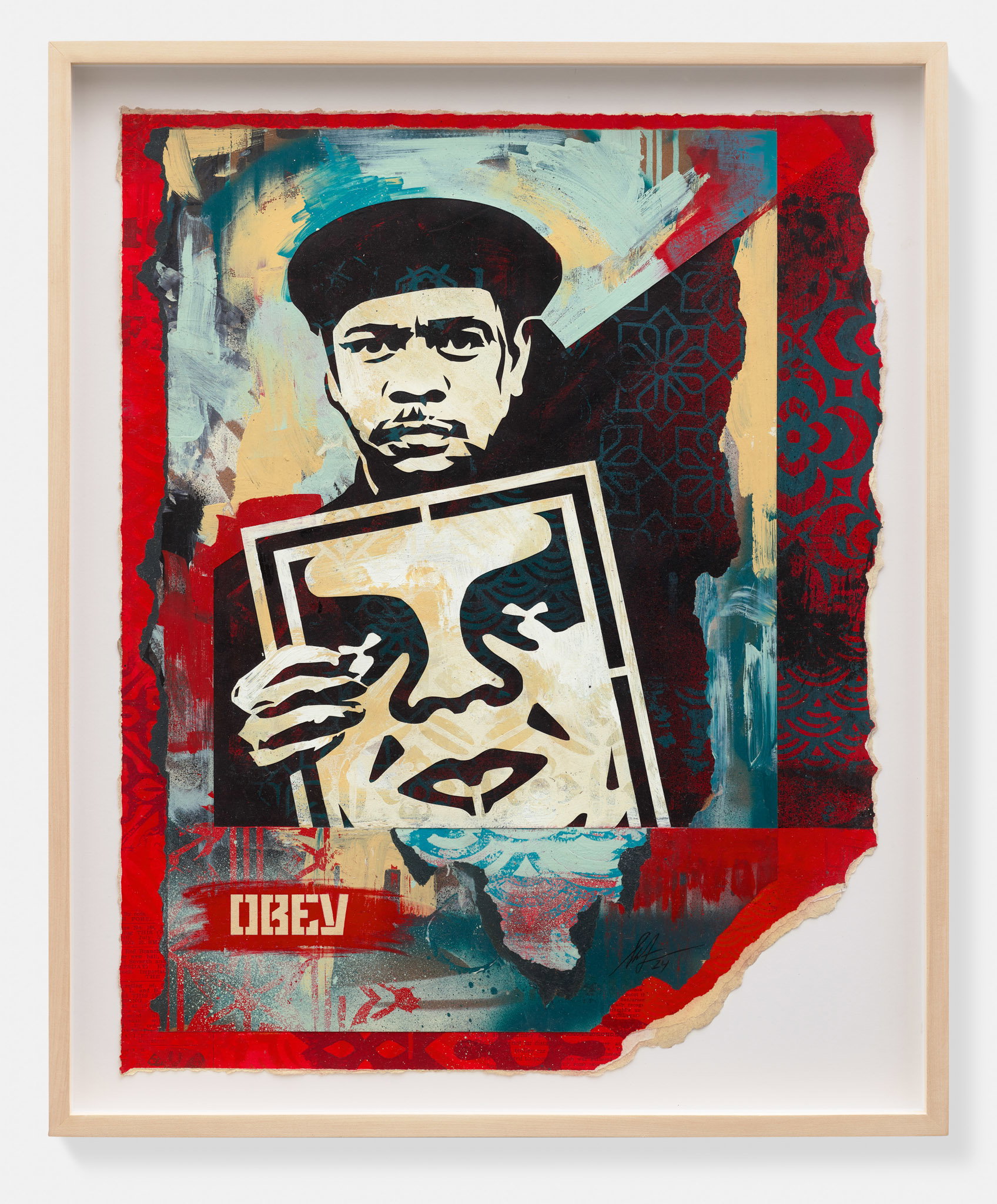 Angry Nubian (Large) is a bold statement work that channels Shepard Fairey's long-standing engagement with themes of identity, resistance, and cultural empowerment through his commanding mixed-media technique of stencil, silkscreen, and collage on paper. The layered process — building up imagery through stencil cuts, screenprinted colour fields, and collaged elements — is central to Fairey's practice, creating works that feel simultaneously mass-produced and intimately handcrafted, echoing both propaganda posters and underground zine culture. The subject, a Nubian figure rendered with fierce dignity, speaks to Fairey's history of celebrating marginalised voices and challenging Eurocentric art-historical canons, giving the work a charged political and cultural significance within the Triple Trouble context. The scale suggested by the 'Large' designation amplifies the confrontational quality of the piece, demanding that the viewer reckon with its subject on equal or greater terms. This work reflects Fairey's conviction that art is inseparable from social commentary, using visual power to assert presence, pride, and resistance.