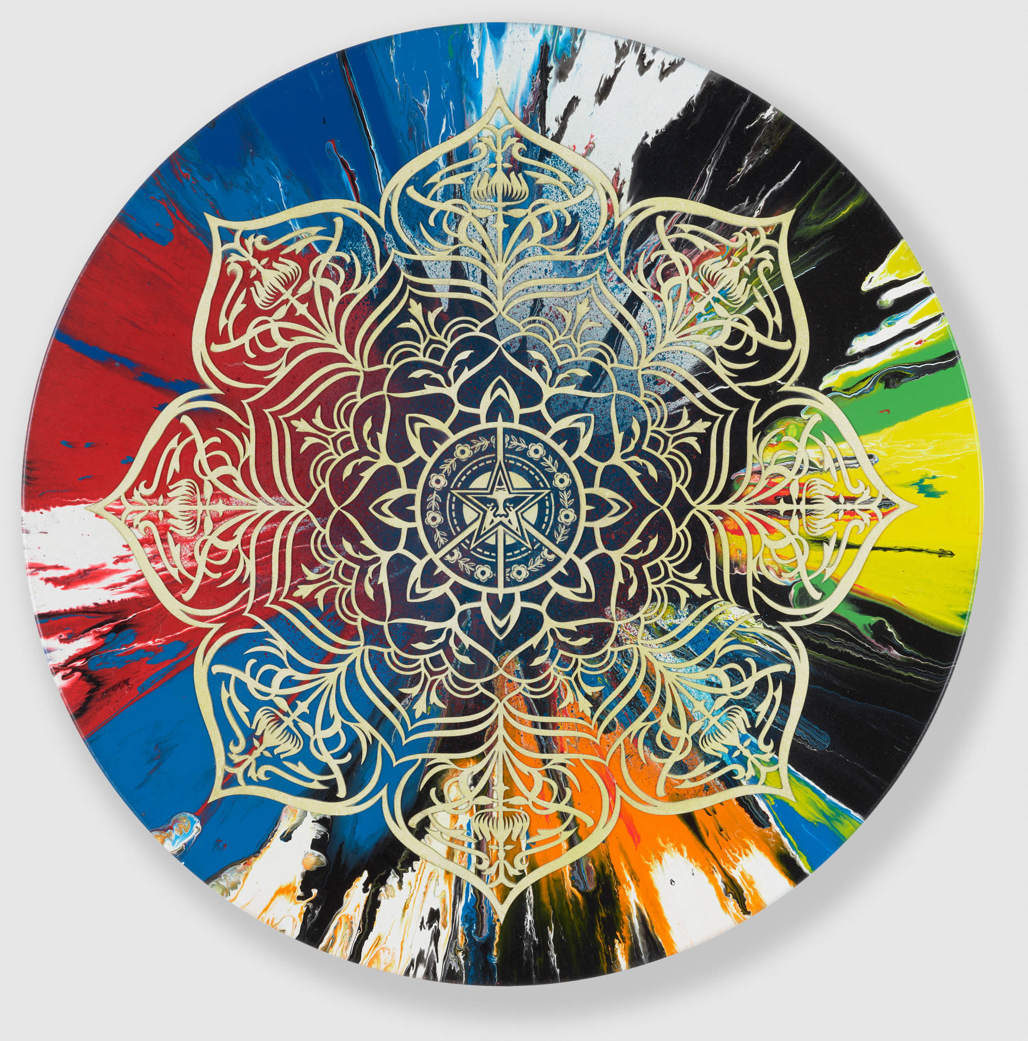 Beautiful Dark Ornate Mandala 1 Spin Painting represents one of the most visually and conceptually rich pairings in the Triple Trouble collection, merging Hirst's iconic spin painting technique with Fairey's bold, propaganda-inflected graphic sensibility. The use of household gloss and spray paint on canvas bridges two distinct material worlds — the centrifugal, chance-driven chaos of Hirst's spin works and the controlled, stenciled precision that defines Fairey's OBEY aesthetic — creating a tension between order and entropy at the heart of the piece. The mandala form carries deep spiritual and symbolic weight, representing wholeness, cyclicality, and the universe in many traditions, yet the 'dark' qualifier in the title introduces a subversive undercurrent, suggesting decay or shadow within beauty. Fairey's layered graphic language gives structure to what Hirst's process dissolves, while Hirst's spinning motion destabilizes Fairey's typically rigid compositional control, producing an artwork that neither artist could have made alone. The result is a meditation on symmetry and disruption, spirituality and spectacle, in equal measure.