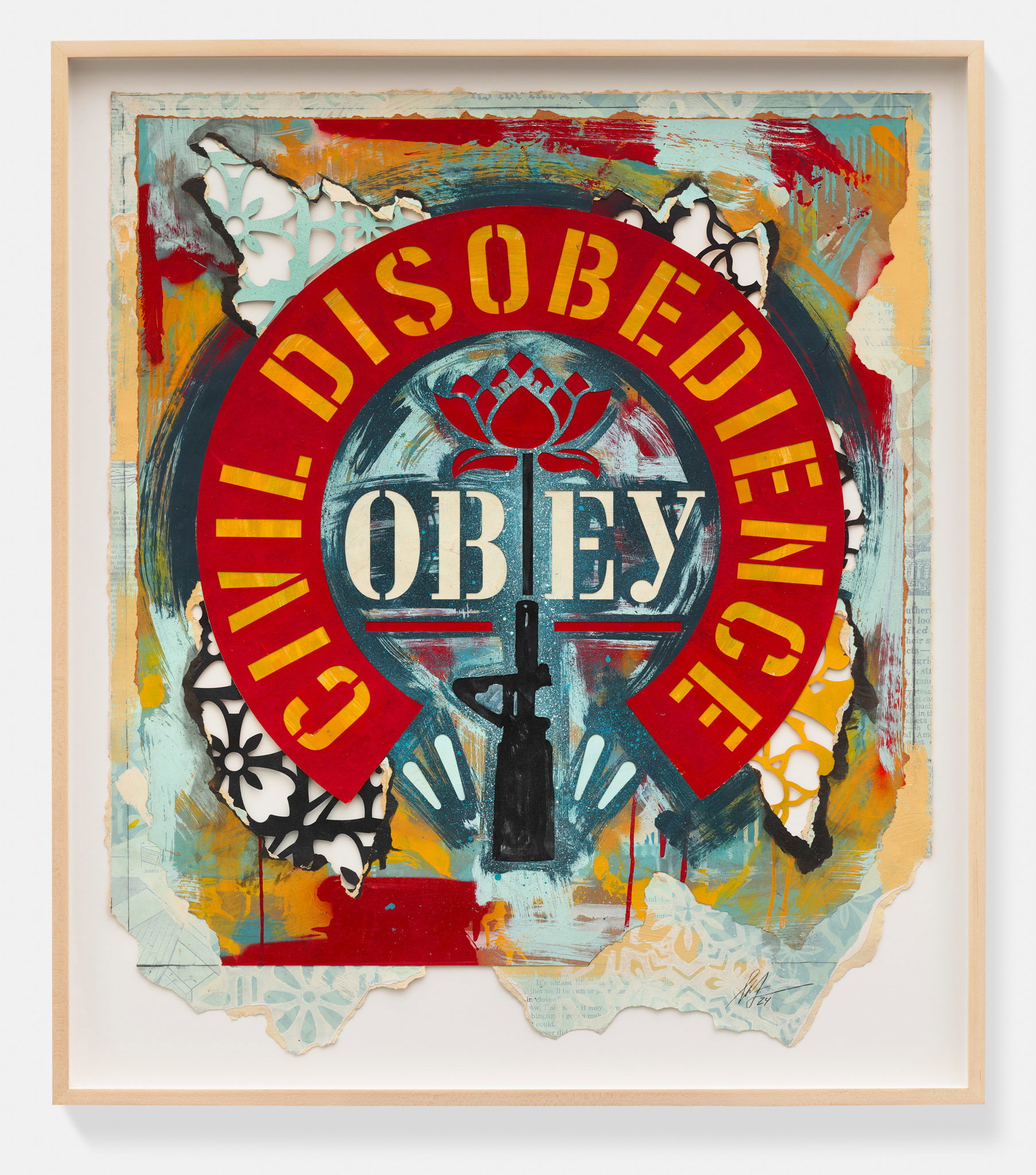 Civil Disobedience distils the political essence of Shepard Fairey's career into a single, charged object, employing his well-honed mixed media approach of stencil, silkscreen, and collage on paper to produce a work that feels simultaneously like street agitation and fine art manifesto. The layered techniques are inseparable from the message: stenciling evokes urgency and reproducibility, the democratising tools of protest; silkscreen connects the work to Pop art's mass-production critique; and collage introduces fragments of found visual culture, implicating the viewer in a broader media landscape. Fairey's signature aesthetic — bold outlines, flat planes of colour, text-driven imagery, and the visual grammar of Soviet-era propaganda reappropriated for progressive ends — is fully deployed here, making the work instantly recognisable as part of his OBEY lineage. Created in 2024, Civil Disobedience arrives at a moment of acute global political tension, lending the title an immediacy that transcends art world discourse and speaks directly to movements for justice, autonomy, and resistance. Within Triple Trouble, the piece anchors the collection's political conscience, reminding viewers that art made in the tradition of the street carries an obligation to speak truth to power.