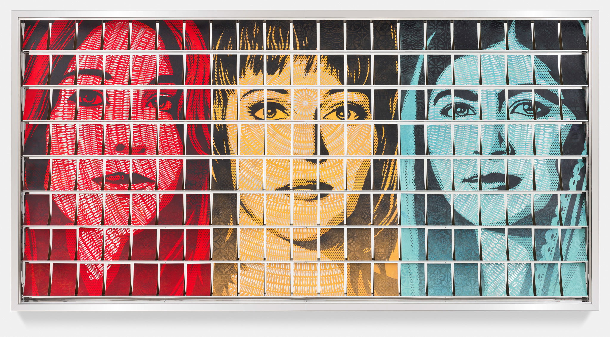 Dissection Under a Microscope stands as one of the most viscerally compelling works in the Triple Trouble collection, merging Hirst's forensic obsession with mortality and the body with Fairey's confrontational graphic sensibility. The use of actual scalpel blades embedded alongside glass and stainless steel transforms the work into a physically dangerous object, echoing Hirst's history of using clinical and surgical materials to force viewers into an uncomfortable proximity with flesh, science, and death. Fairey's spray paint and collage on cotton rag paper grounds the piece in the street art tradition, introducing his trademark layered, propaganda-inflected aesthetic into what might otherwise read as a sterile medical tableau. Together, the materials suggest a tension between institutional authority — the cold precision of surgery and science — and the anarchic, democratizing impulse of street art. The title itself implies an act of exposure and scrutiny, inviting reflection on what it means to look closely at something, whether a body, a system, or an ideology.