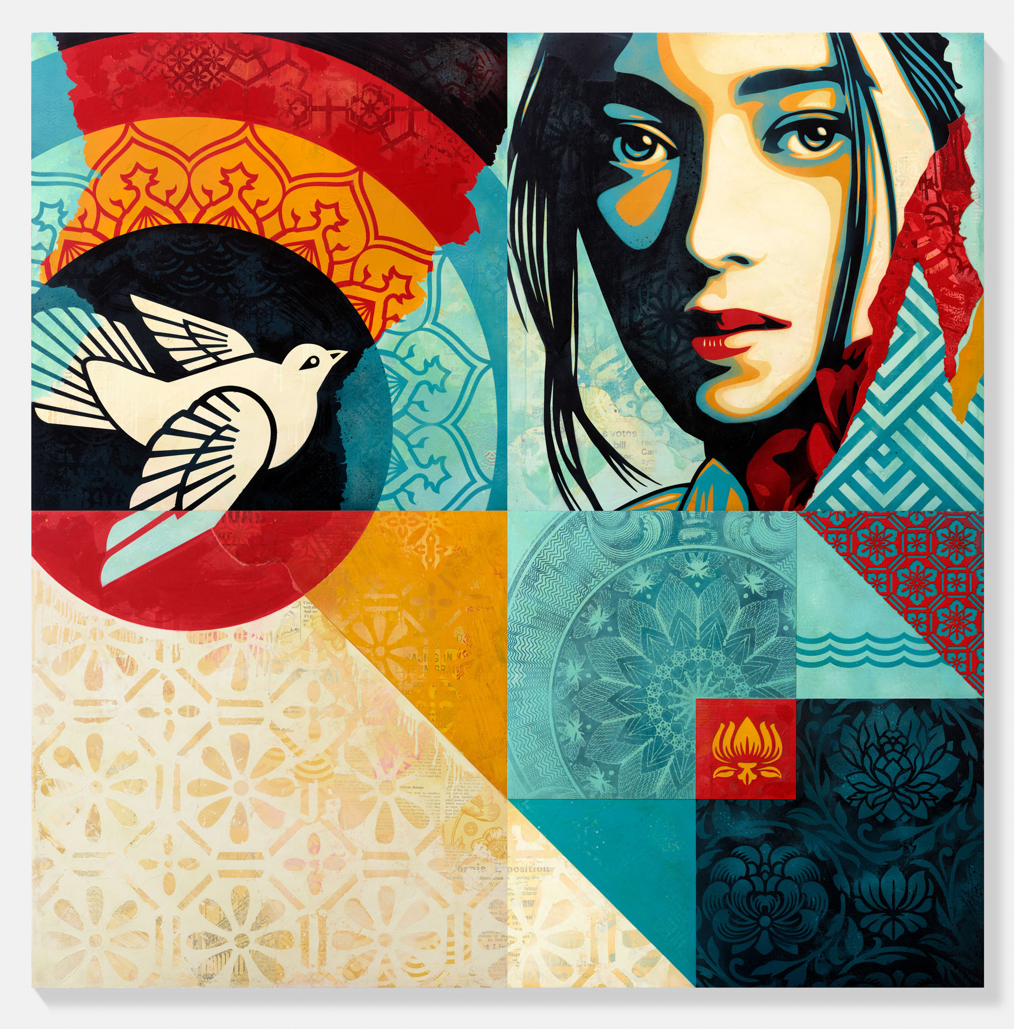 Lotus Ornament is a masterwork of Shepard Fairey's multilayered mixed media practice, combining stencil, silkscreen, and collage across a four-part modular wood structure that demands both close inspection and wide-angle contemplation. Created in 2022 and brought into the Triple Trouble constellation, the work demonstrates Fairey's ability to wed decorative opulence with politically and spiritually charged symbolism — the lotus being a near-universal emblem of rebirth, purity, and the emergence of beauty from difficult conditions. The modular format is significant, echoing the tiled, grid-based logic of Invader's mosaic installations and suggesting that meaning, like the artwork itself, is assembled from discrete units into a greater whole. Stencil and silkscreen techniques root the piece firmly in Fairey's street art heritage, where reproducibility and graphic impact are tools of cultural intervention, while the collage elements introduce textural depth that rewards intimate viewing. As a standalone Fairey work within the collaboration, Lotus Ornament anchors the collection in craft and intentionality, reminding viewers that beneath the spectacle of the Triple Trouble project lies a serious engagement with symbol, structure, and the politics of beauty.