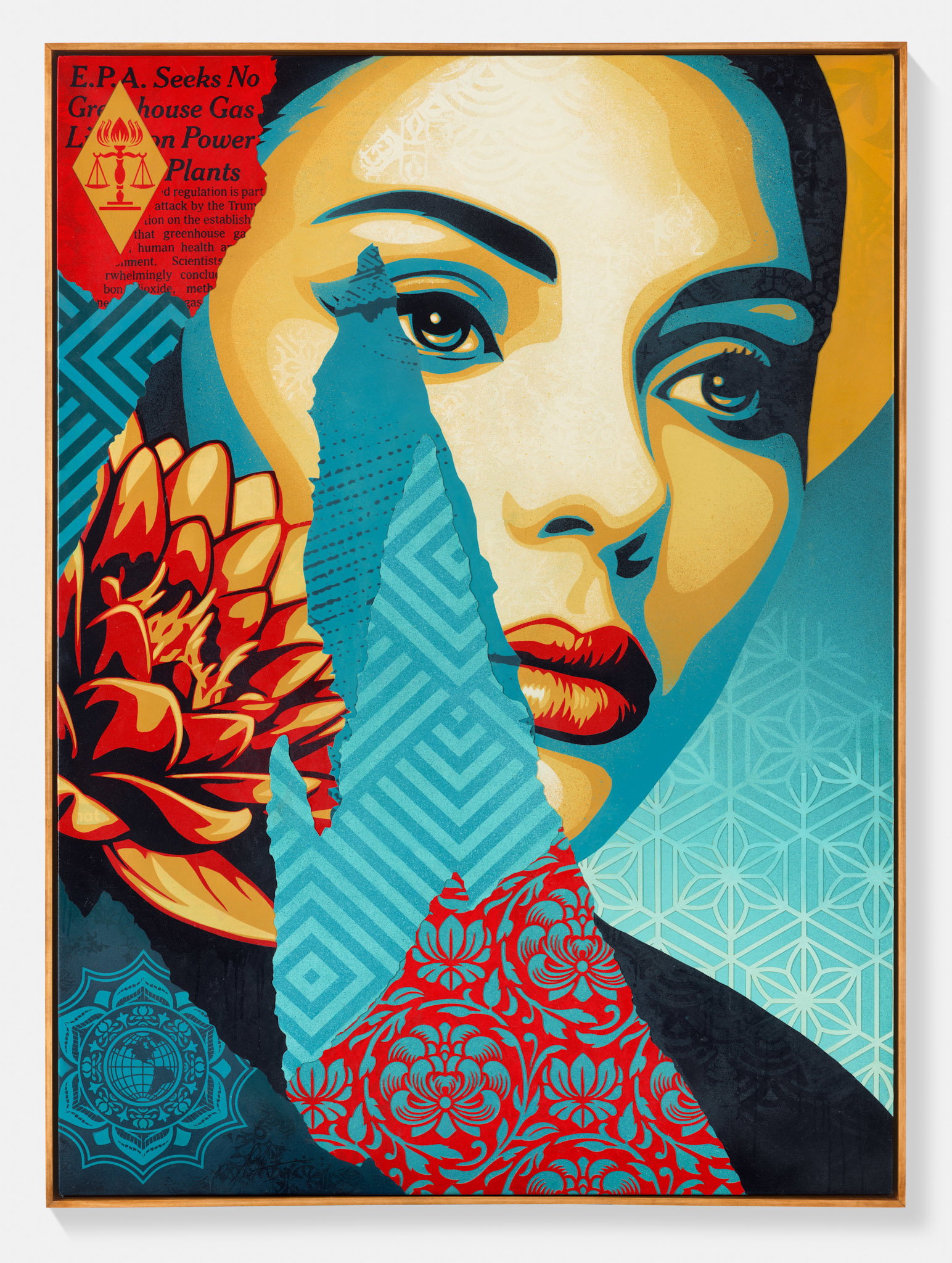One Earth is a powerful environmental statement from Shepard Fairey, channeling his decades-long tradition of activist graphic art into a richly layered mixed-media composition on canvas. The combination of stencil, silkscreen, and collage is central to Fairey's artistic identity, allowing him to build visual complexity through accumulated mark-making that echoes the texture of urban walls and mass-printed protest material. The title invokes a universalist, ecological ethos that aligns with Fairey's history of politically charged imagery, from the iconic Obama Hope poster to his ongoing OBEY campaigns addressing climate and social justice. By working on canvas rather than in the street or on paper, Fairey elevates his agitprop vocabulary into the fine art space without diluting its urgency, a tension that has defined his career since the OBEY Giant campaign of the late 1980s. The work ultimately frames environmental stewardship as both a personal and collective imperative, demanding that the viewer reckon with their relationship to the planet as a unified, fragile system.