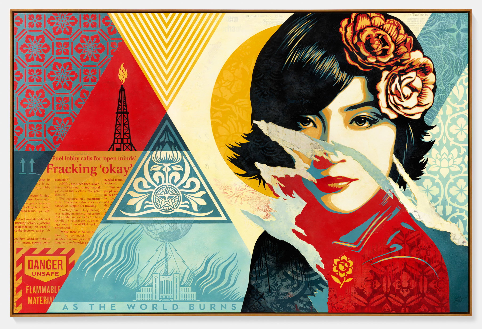 Open Minds, Version 1 is a rich layering of Fairey's most sophisticated techniques — stencil, silkscreen, and collage — deployed on canvas to create a visual argument for intellectual and perceptual freedom. The title carries an unmistakable ideological charge, consistent with Fairey's career-long use of propaganda aesthetics to subvert rather than enforce conformity, encouraging viewers to question dominant narratives rather than absorb them passively. The collage element introduces a fragmentation of visual sources — a hallmark of Fairey's process — that implies the construction of meaning from disparate cultural materials, reinforcing the 'open mind' thesis through form as much as content. Within the Triple Trouble collaboration, this piece represents the street-art pillar at its most politically articulate, carrying the OBEY movement's tension between mass communication and individual awakening. Its 2021 date also situates it within a period of acute global social fracture, lending the call for open minds an urgent, almost desperate sincerity.