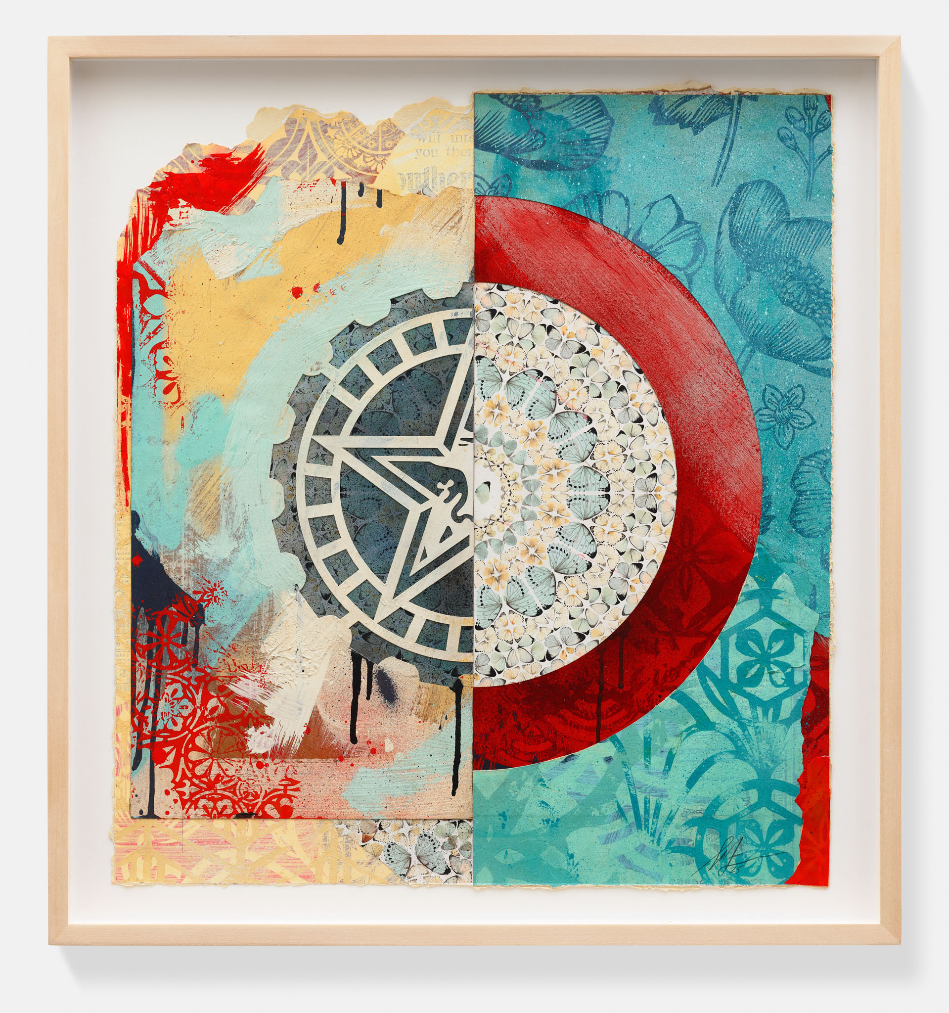 This richly layered mixed-media work represents one of the most explicit moments of cross-pollination within the Triple Trouble collection, with Shepard Fairey directly incorporating Damien Hirst's iconic butterfly motifs into his own stencil, silkscreen, and collage vocabulary on paper. The butterflies, synonymous with Hirst's meditations on mortality, beauty, and the exploitation of natural forms, are here recontextualized within Fairey's bold graphic geometry, creating a visual dialogue between two of contemporary art's most recognizable signature languages. Fairey's star and gear imagery carries its own symbolic weight, evoking propaganda aesthetics, industrial labor, and the machinery of power, and placing Hirst's delicate butterflies within that framework introduces a compelling tension between fragility and force. The use of paper as a support honors both artists' roots in accessible, reproducible formats — Hirst's early print work and Fairey's origins in skate and street culture — while the mixed-media technique elevates the piece into something singular and unrepeatable. Within the broader Triple Trouble context, this work feels like the collection's most self-aware statement, a piece that is explicitly about collaboration itself and about what happens when distinct artistic mythologies are made to coexist on a shared surface.