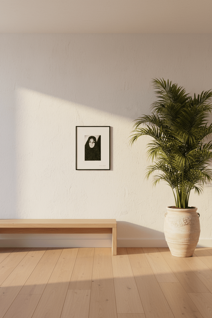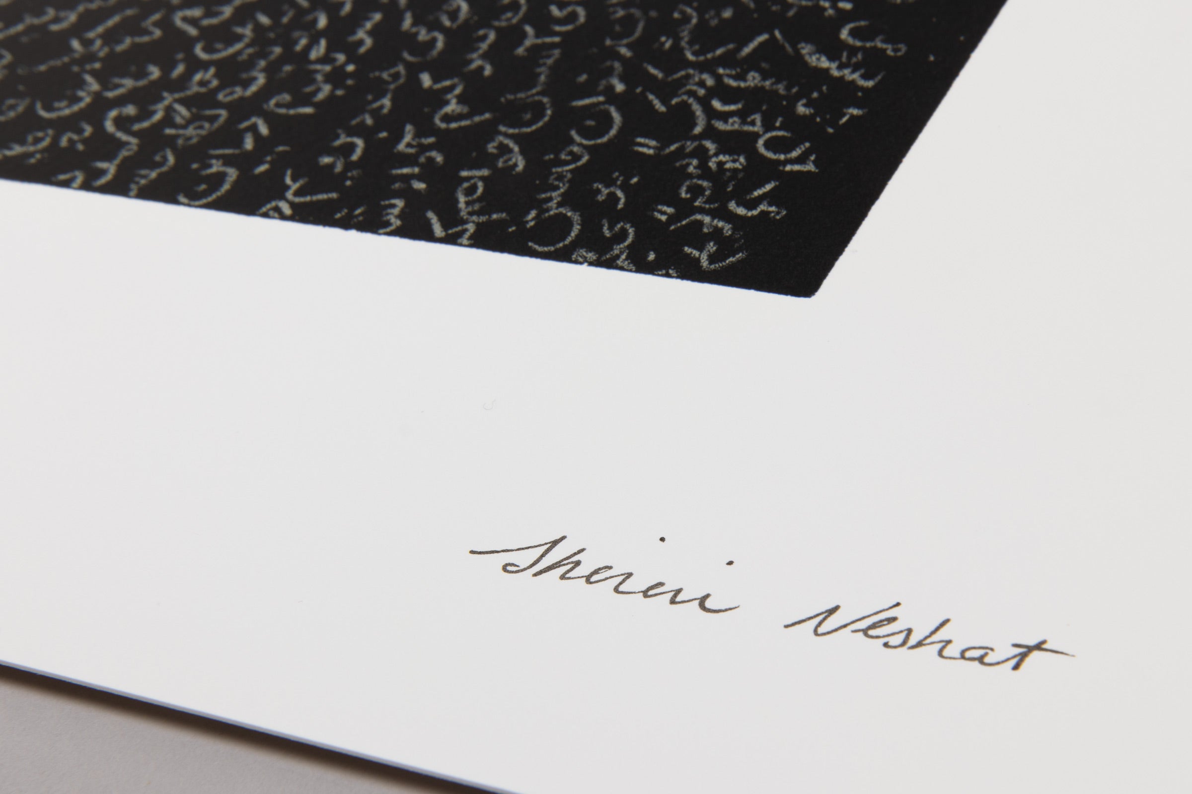 Shirin Neshat ’s Unveiling Series #1 (1993, 2025) is a signed pigment print with silkscreen and a varnish seal on paper, presenting a striking black and white portrait of a veiled woman whose face and chador are meticulously overlaid with handwritten Persian calligraphy. The script, inspired by modern Iranian poetry and closely associated with the voice of Forough Farrokhzad , weaves across the image in rhythmic, flowing lines that merge text and portraiture into a unified visual field. The calligraphy acts as both veil and revelation, transforming language into a form of symbolic adornment while aligning the image with the broader tradition of text-based art . By embedding poetic text directly onto the female body and its coverings, Neshat blurs the boundary between inner voice and outward representation, evoking a tension between visibility and silence that defines much of her early photographic work. Rooted in cultural memory and poetic resistance, the limited edition print captures the emotional depth and political subtlety that have come to characterize Neshat’s practice.