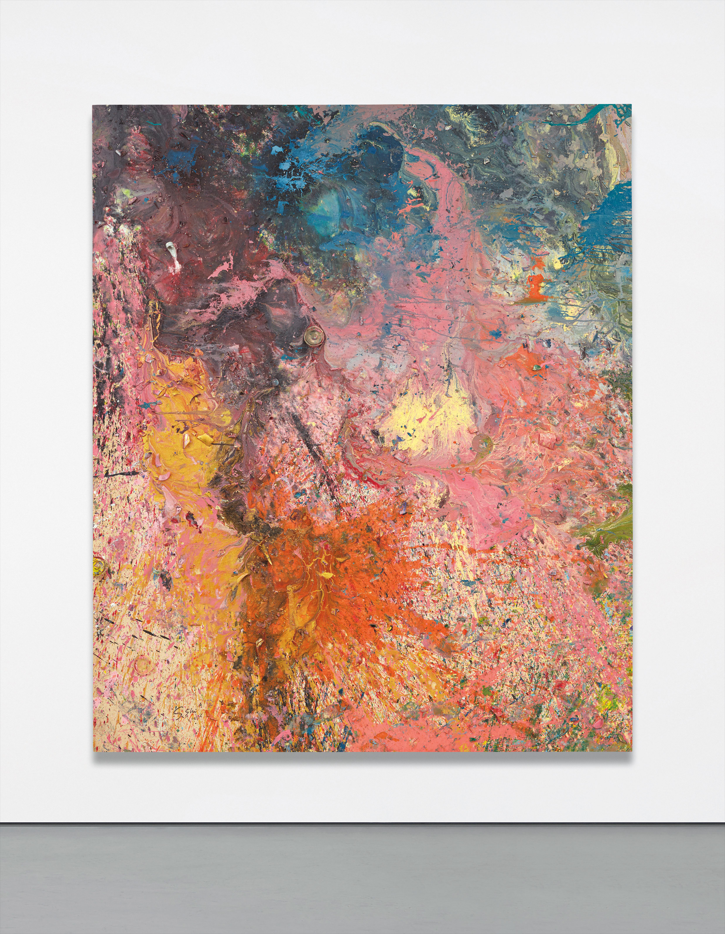 A dynamic explosion of shattered glass and vibrant enamel paint creates a raw, visceral surface that pulses with chaotic energy. Shimamoto's action-based technique transforms destruction into creation, as jagged shards embed themselves within the richly colored paint, casting dramatic shadows and refracting light across the canvas. The work reflects the artist's Gutai spirit, challenging traditional notions of painting by embracing accident, force, and the physical properties of unconventional materials.