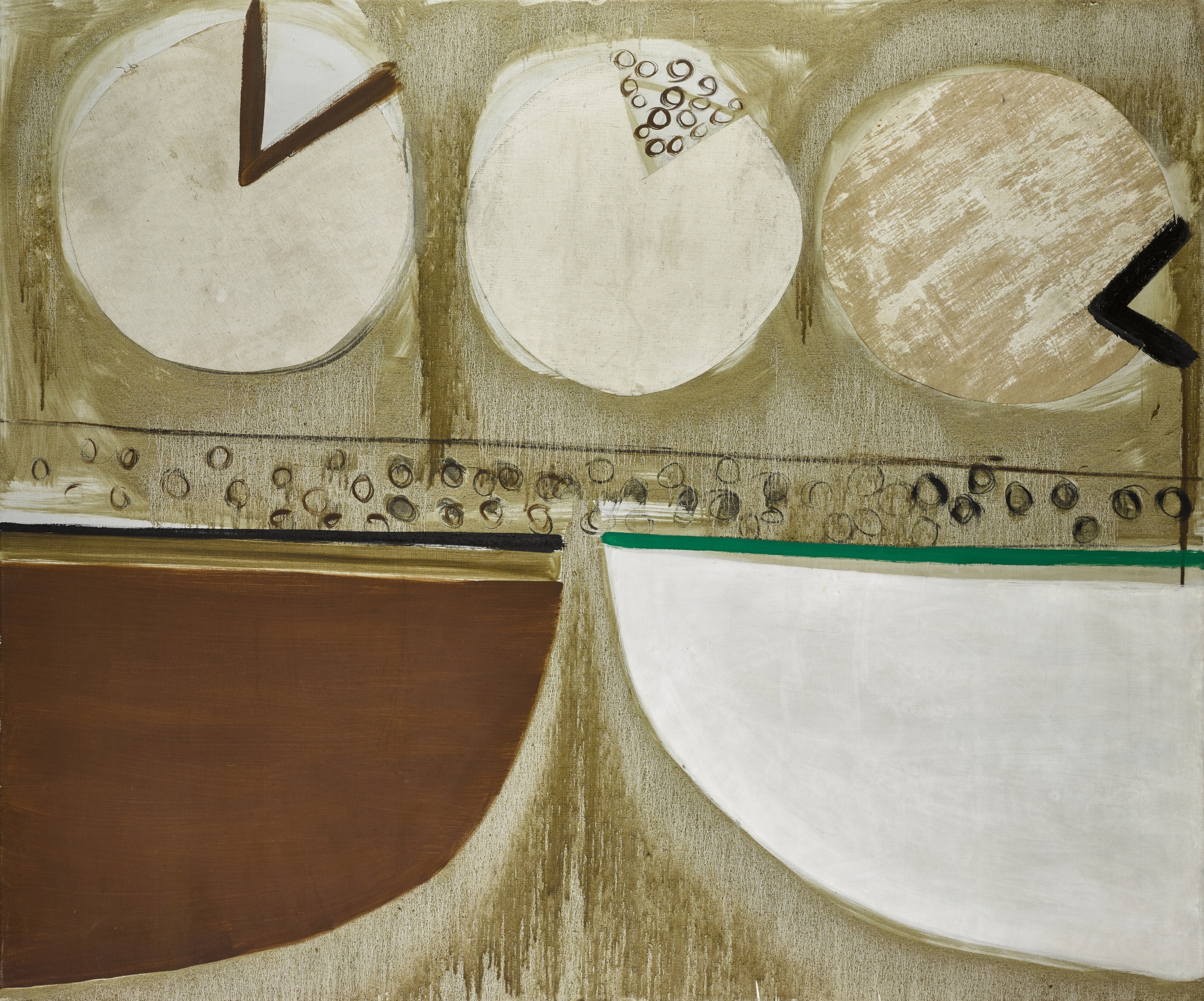 Terry Frost's Harvest Moons (1962) is an oil painting on canvas featuring the artist's characteristic abstract compositions with vibrant color relationships. The work demonstrates Frost's synthesis of Abstract Expressionism with British artistic traditions.