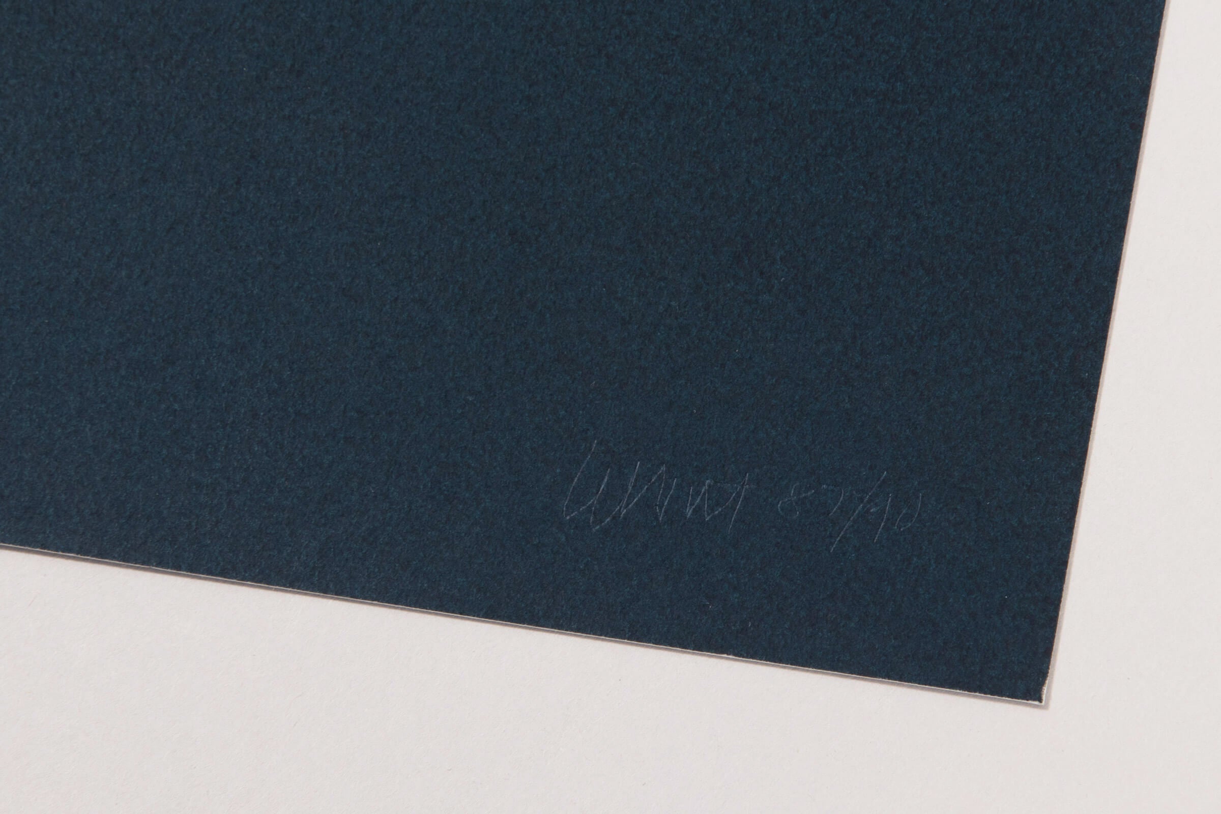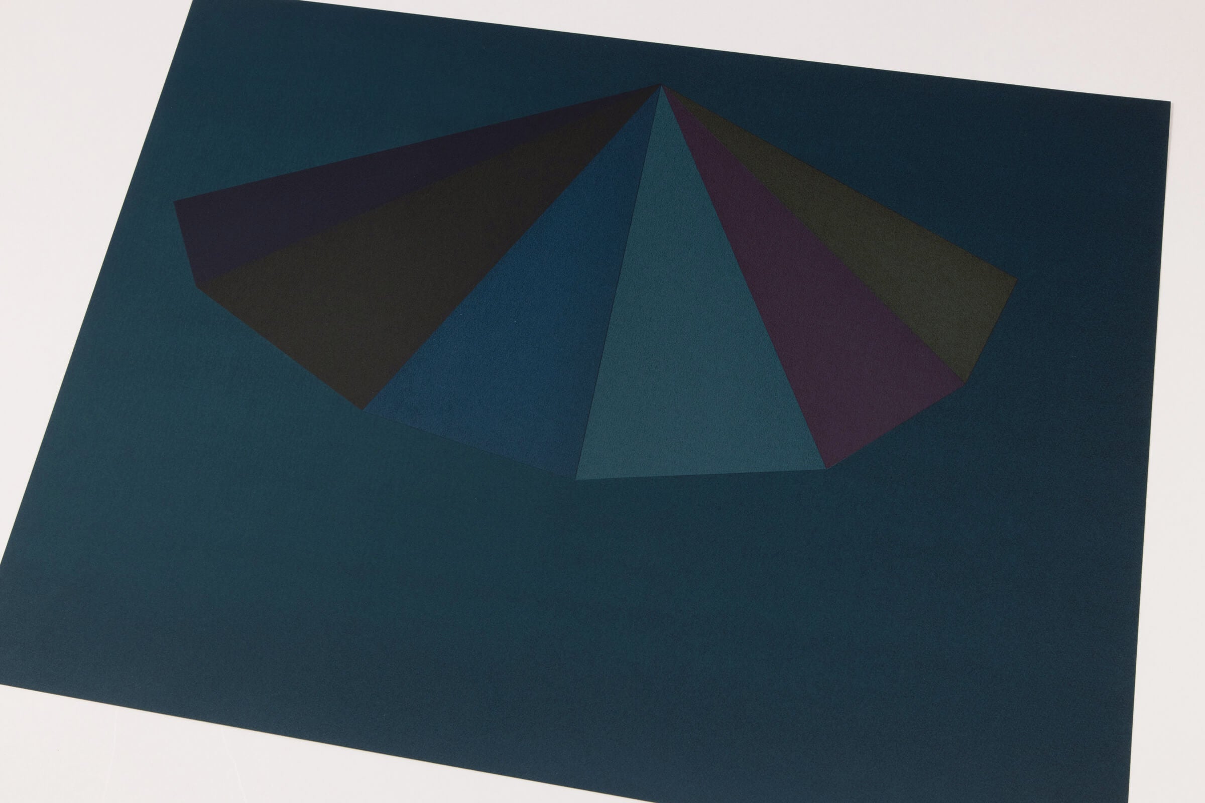 This signed screenprint , produced as a limited edition, was contributed by Sol LeWitt to the group portfolio For Joseph Beuys . The geometric fine art print features a pyramid-like structure composed of tapering triangles arranged in a semicircular formation, where strict geometry stands in deliberate contrast to the surrounding empty space, creating a sense of volume, depth, and a contemplative spatial presence. Published as a posthumous tribute to Joseph Beuys in 1987 , the portfolio brought together 30 artists, positioning LeWitt’s cool, systematic approach to abstract artworks as a conceptual counterpoint to Beuys’ mythic and socially charged legacy.