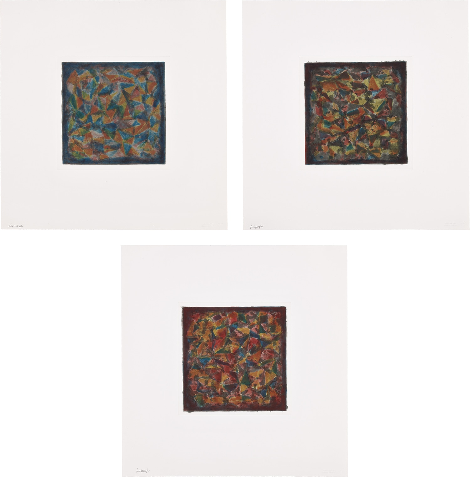 A triptych of colored etchings and aquatints on Somerset paper exploring the relationship between color and black forms. The series demonstrates LeWitt's systematic approach to chromatic variation across multiple plates.