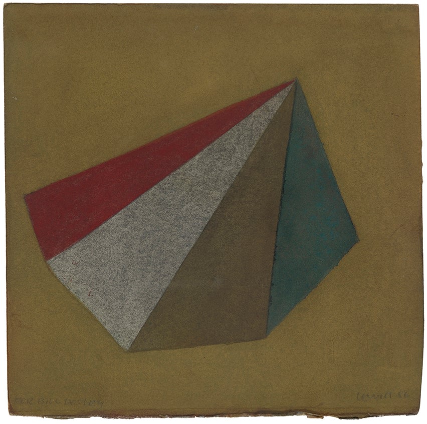 A precise geometric pyramid rendered in delicate washes of watercolour and fine pencil lines on paper, reflecting Sol LeWitt's enduring fascination with fundamental three-dimensional forms translated into two-dimensional space. The work exemplifies LeWitt's systematic and conceptual approach to art-making, where mathematical structure and rational process govern aesthetic decisions. Subtle gradations of colour within the geometric form hint at volume and depth while maintaining the cool, intellectual clarity characteristic of his practice.