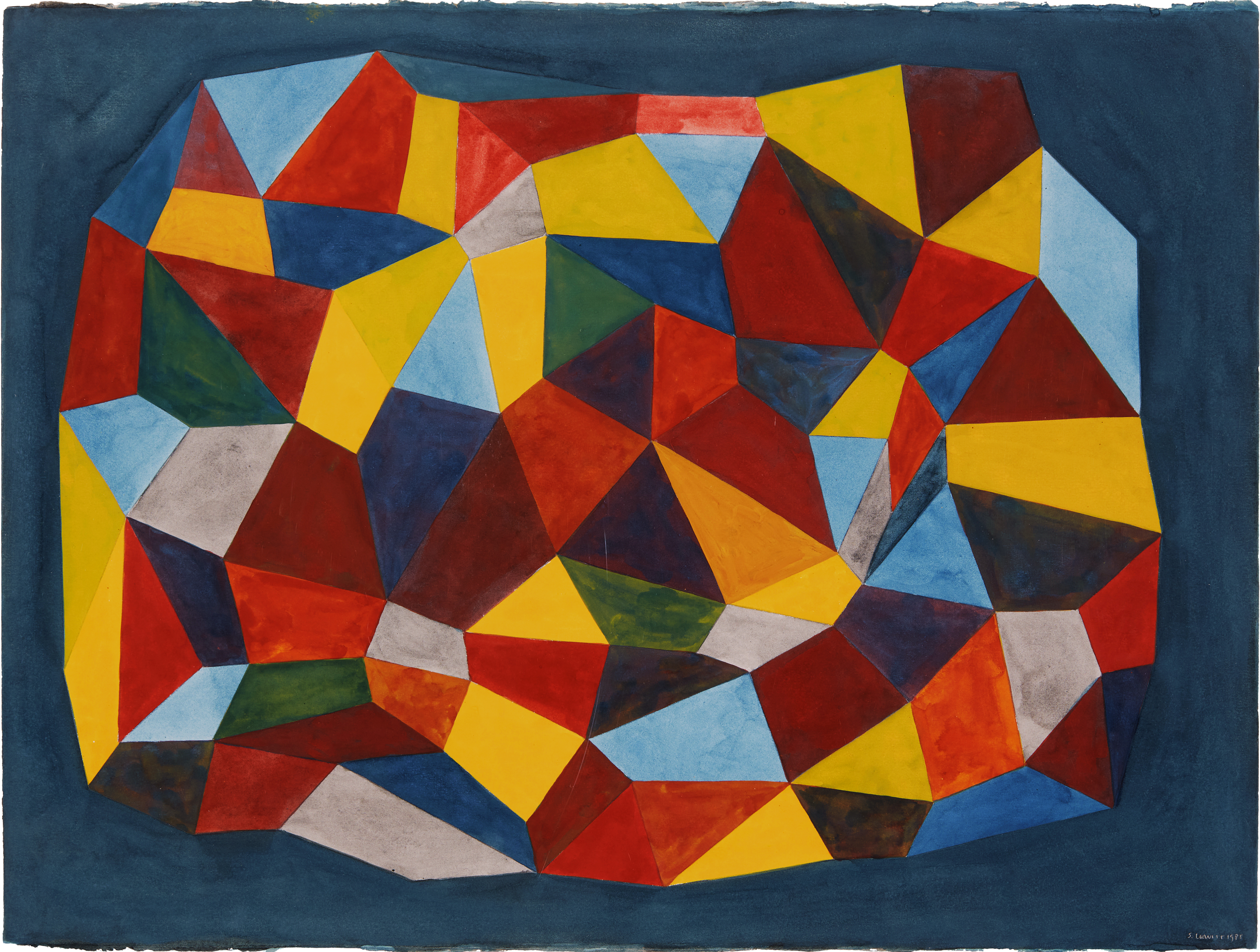 Sol LeWitt's gouache on paper work exemplifies his conceptual approach to systematic abstraction, wherein predetermined rules and mathematical logic generate the visual composition rather than intuitive gesture. The layered geometric forms create a sense of spatial complexity and visual depth within the bounded rectangular format, characteristic of his exploration of how simple organizational systems can produce intricate, visually compelling results. This work reflects LeWitt's broader artistic philosophy that the idea or concept behind an artwork is more important than its physical execution.