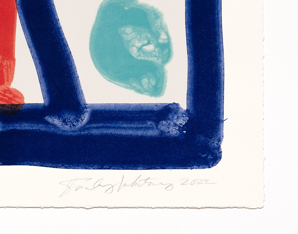 Peace Be Still presents a vibrant composition of stacked rectangular forms rendered in five carefully orchestrated colors through lithographic technique. Whitney constructs a visual field where warm ochres, deep blues, and accent hues create a rhythmic interplay of overlapping planes that suggest both architectural structure and abstract meditation. The work operates as a study in chromatic harmony, where each color field maintains its own presence while contributing to a unified whole, demonstrating the artist's sustained exploration of color relationships and compositional balance. The Somerset Satin paper grounds the composition with a tactile quality that enhances the subtlety of the printed hues, while the substantial 410gsm weight ensures the work's longevity and presence. This 2022 lithograph represents Whitney's continued engagement with color abstraction and the formal possibilities of the print medium. Executed in an edition of 125, the work exemplifies the artist's disciplined approach to composition, where seemingly simple stacked forms reveal complex spatial relationships and chromatic resonance upon sustained viewing. The title invokes a sense of spiritual calm and order, suggesting that Whitney's formal investigations carry metaphorical weight beyond their visual construction. For collectors, this piece offers access to Whitney's mature practice at a significant scale, combining the intimacy of printmaking with the monumental impact of his larger studio works.