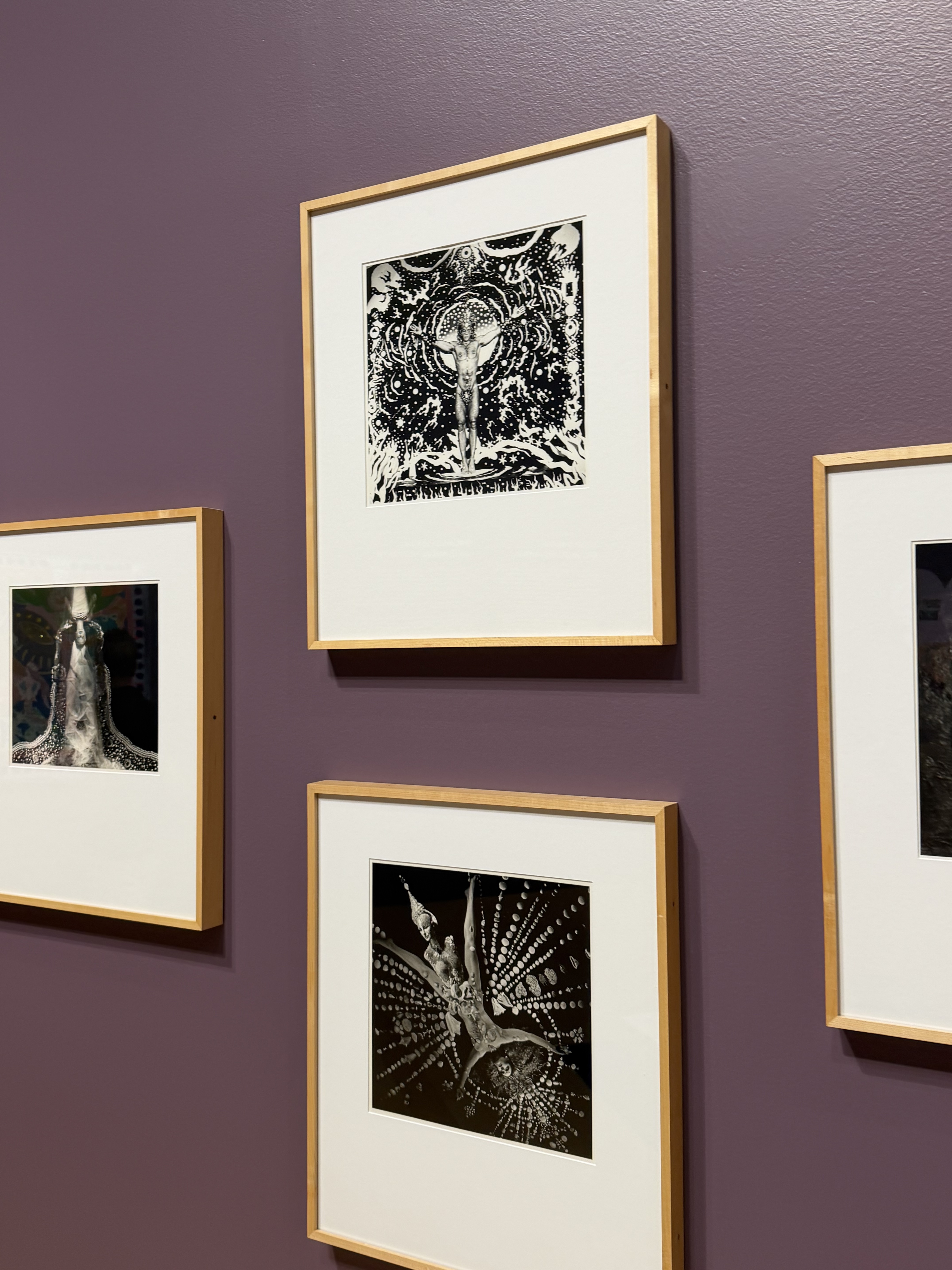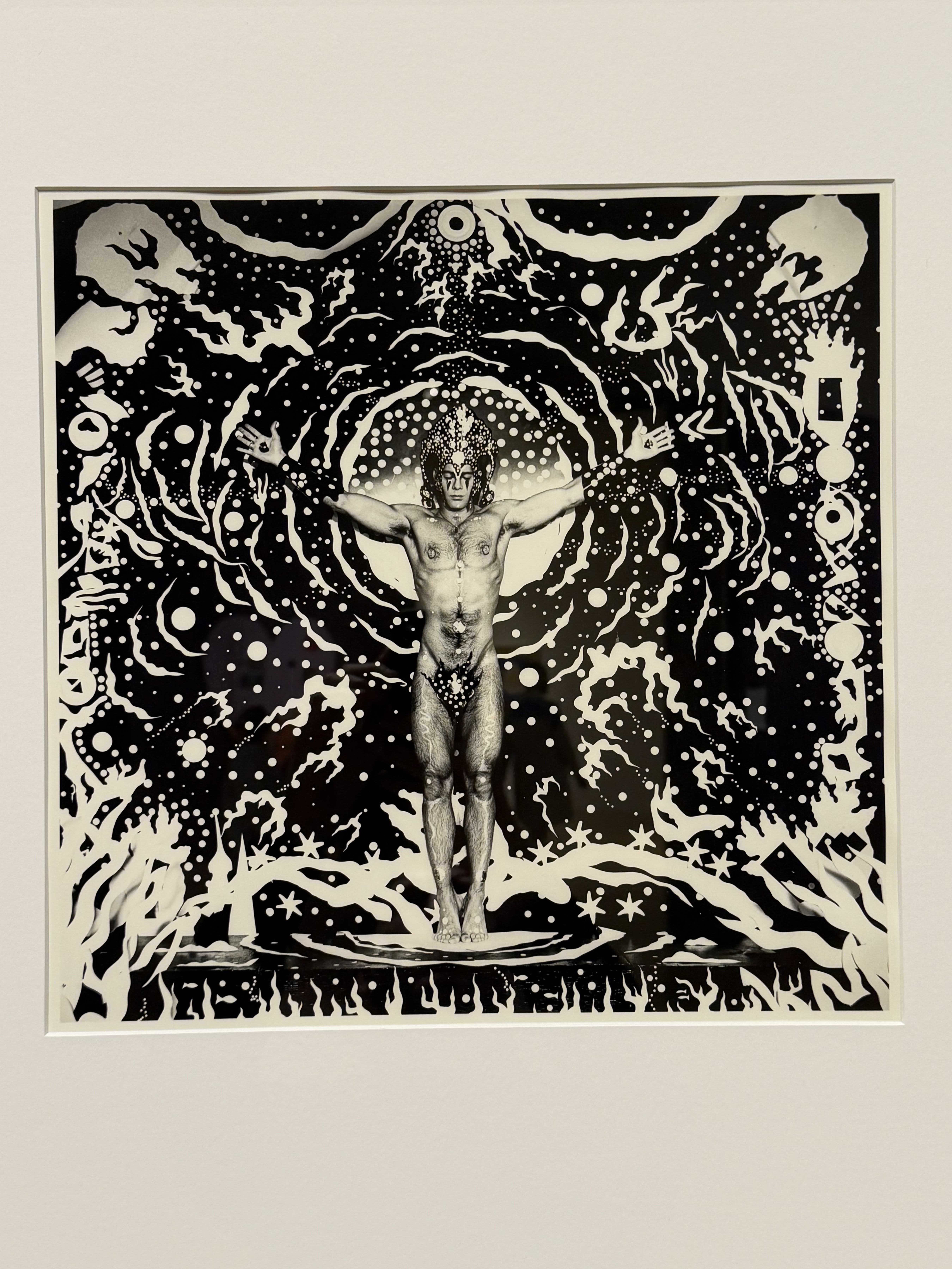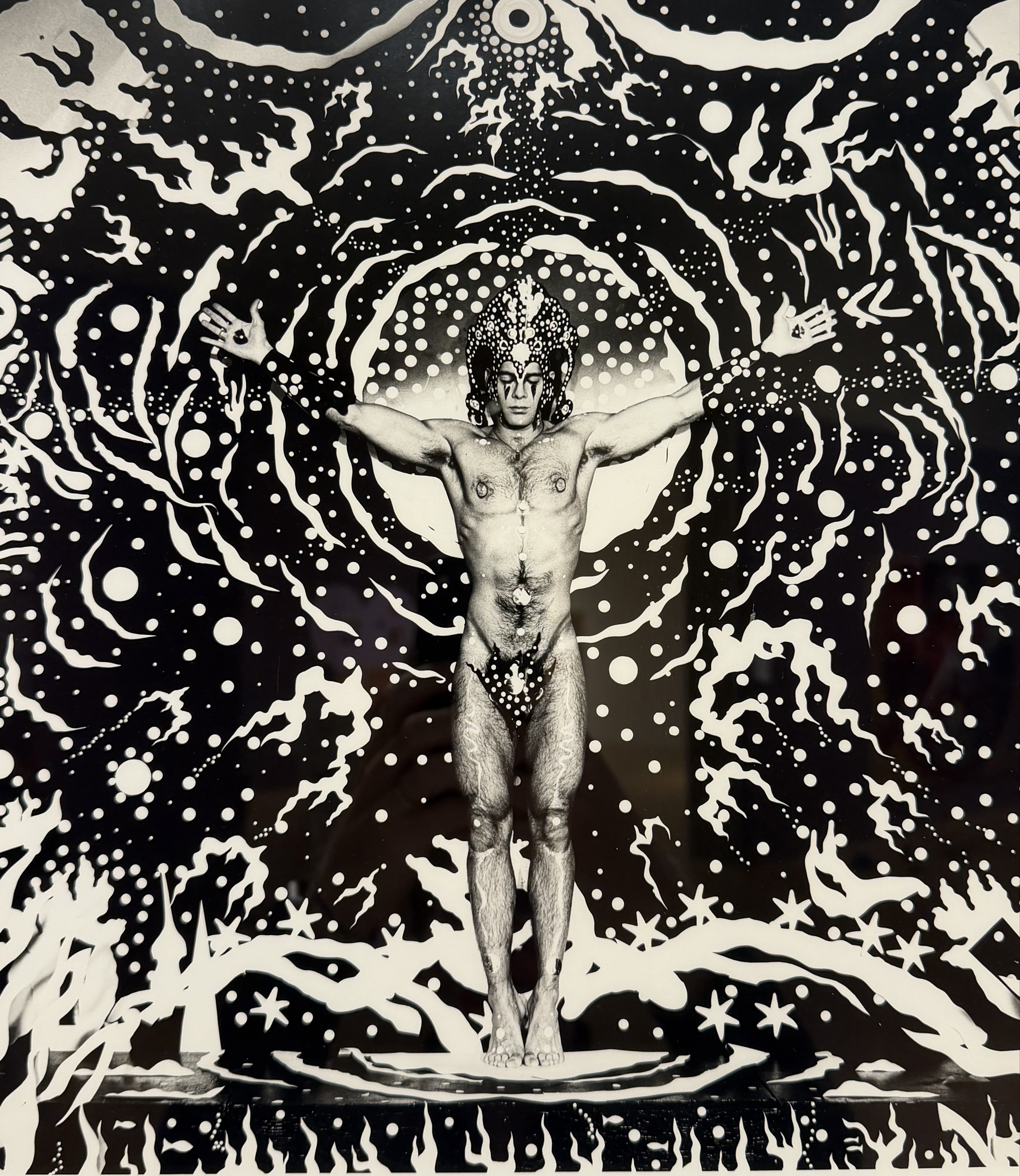A striking large-format gelatin silver print by Steven Arnold depicting a nude male figure standing in a cruciform pose with elaborate body paint and headdress, set against an intricate black-and-white cosmic backdrop constructed from cut paper and found objects. The work features Arnold's muse Pandora (1942–2023) and exemplifies his tableau vivant approach, likening his photographs to Tibetan thangkas used as meditation tools. Produced at Arnold's celebrated Los Angeles studio, Zanzibar, this photograph explores themes of spirituality, mortality, and eroticism rooted in the counterculture of the 1960s San Francisco Bay Area. The work belongs to a cohesive body of photographs gifted to a major museum by the Steven Arnold Museum and Archives, Los Angeles.