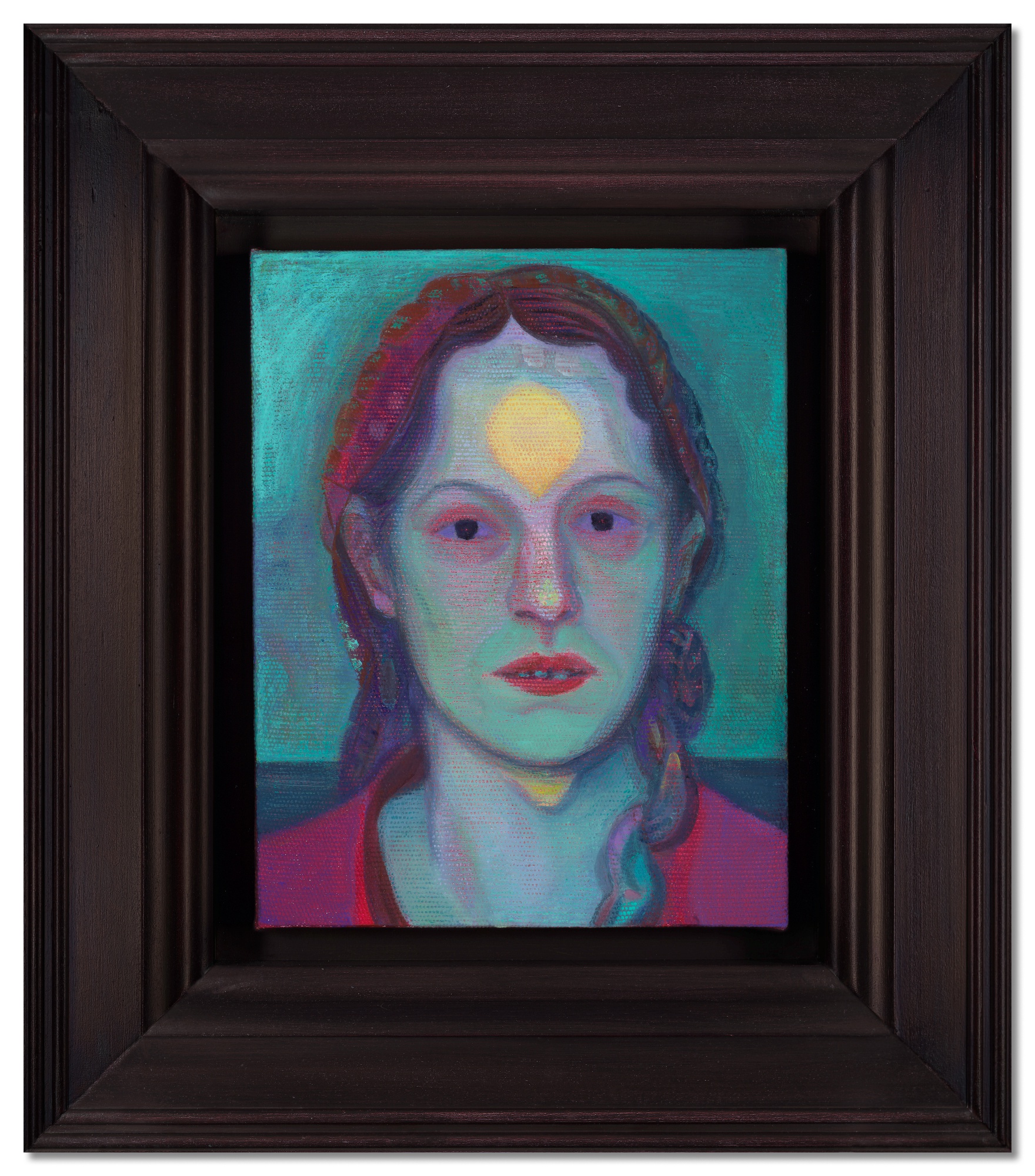 Steven Shearer's mixed-media work on linen combines oil, oilstick, and pastel in a dynamic composition presented in the artist's custom frame. The layered technique creates visual complexity and textural richness.