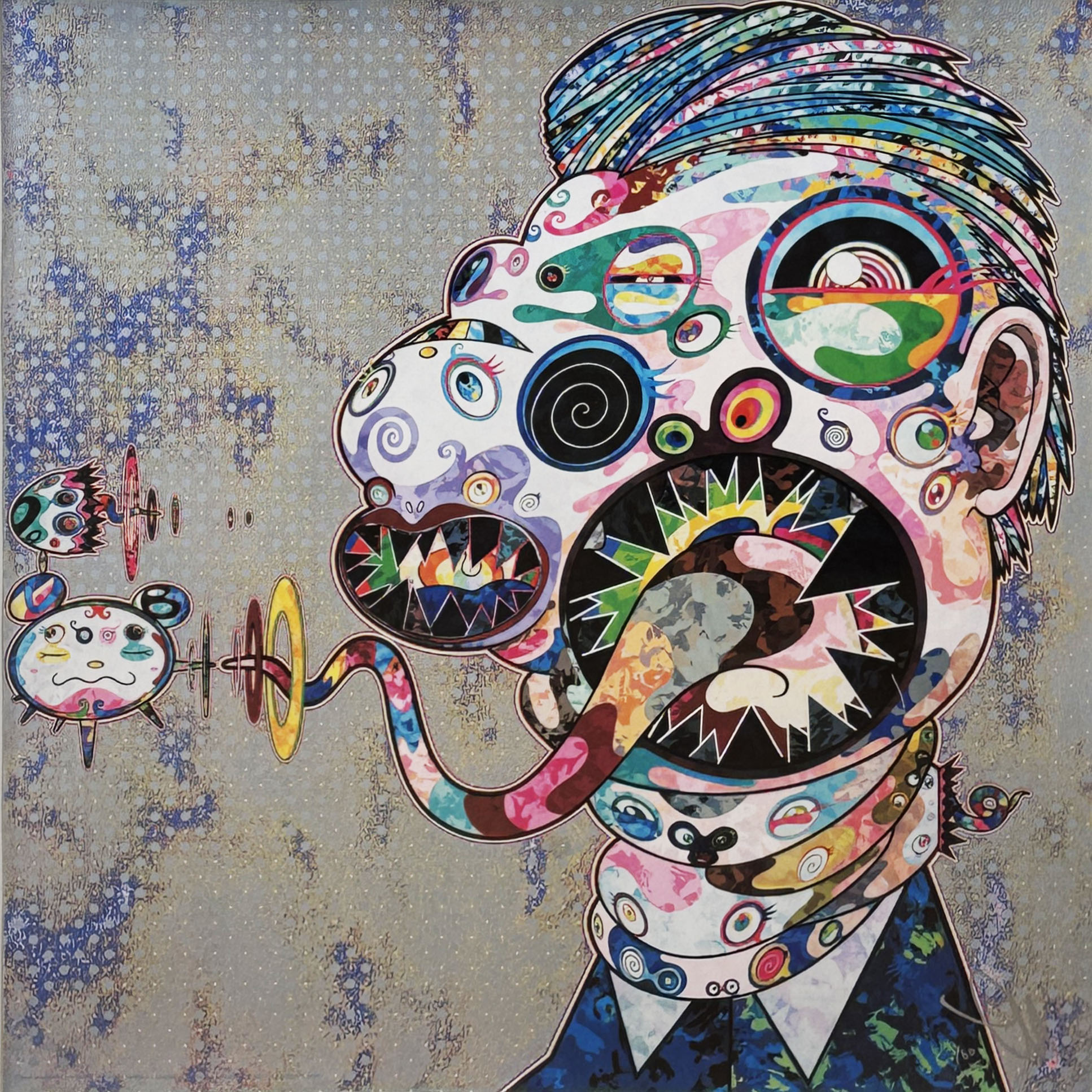 This 2016 offset lithograph represents Murakami's distinctive reinterpretation of Francis Bacon's psychological portraiture, applying his signature pop aesthetic and moiré patterning techniques to the British master's distorted figurative studies. The work exemplifies Murakami's ongoing dialogue between contemporary Japanese pop culture and Western art historical traditions.