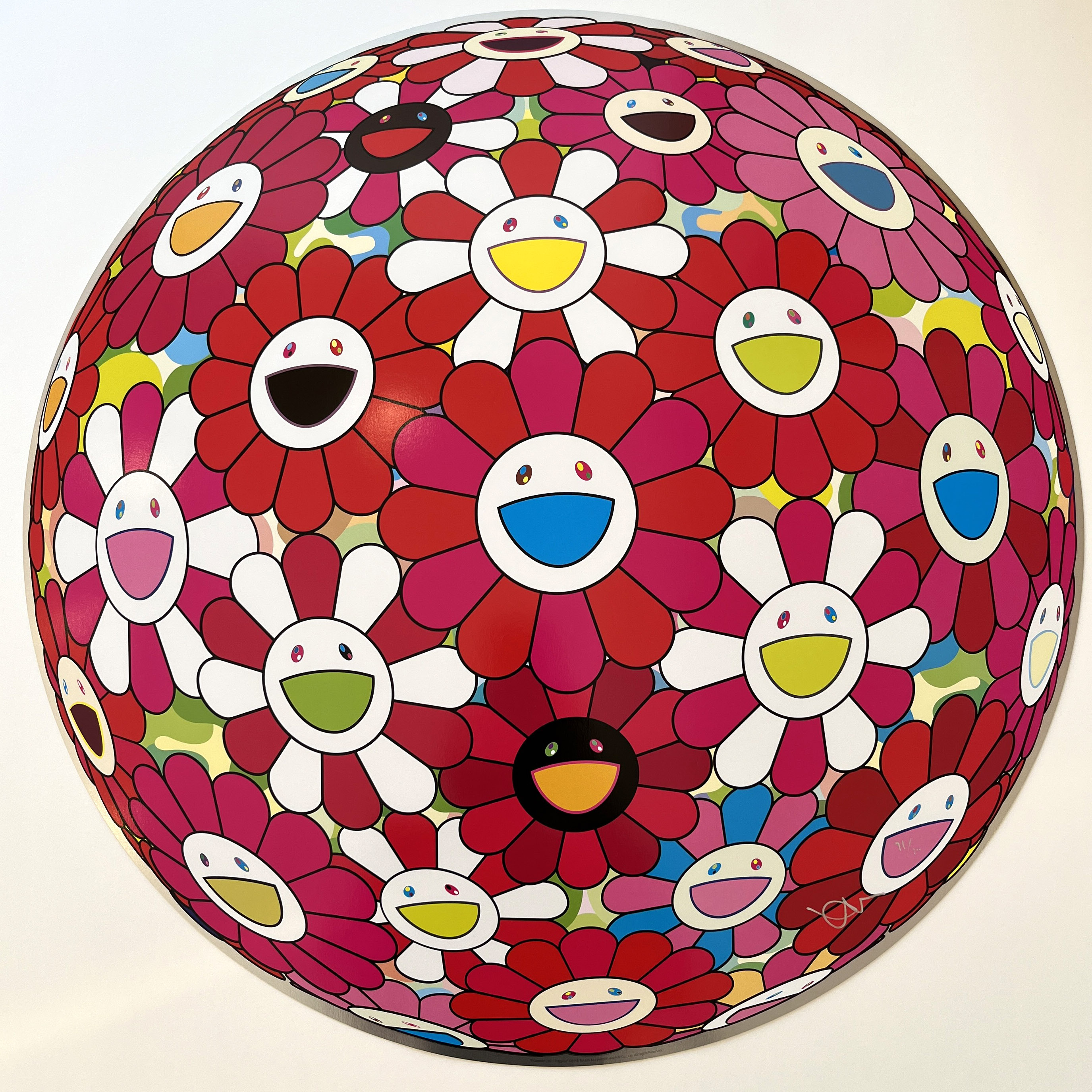 This vibrant offset lithograph exemplifies Murakami's iconic "Superflat" aesthetic, transforming his signature colorful flowers into a three-dimensional spherical composition enhanced by cold stamp detailing and high gloss varnishing. The work demonstrates the artist's mastery of bridging fine art and commercial printing techniques while maintaining his distinctive pop-inflected visual language.
