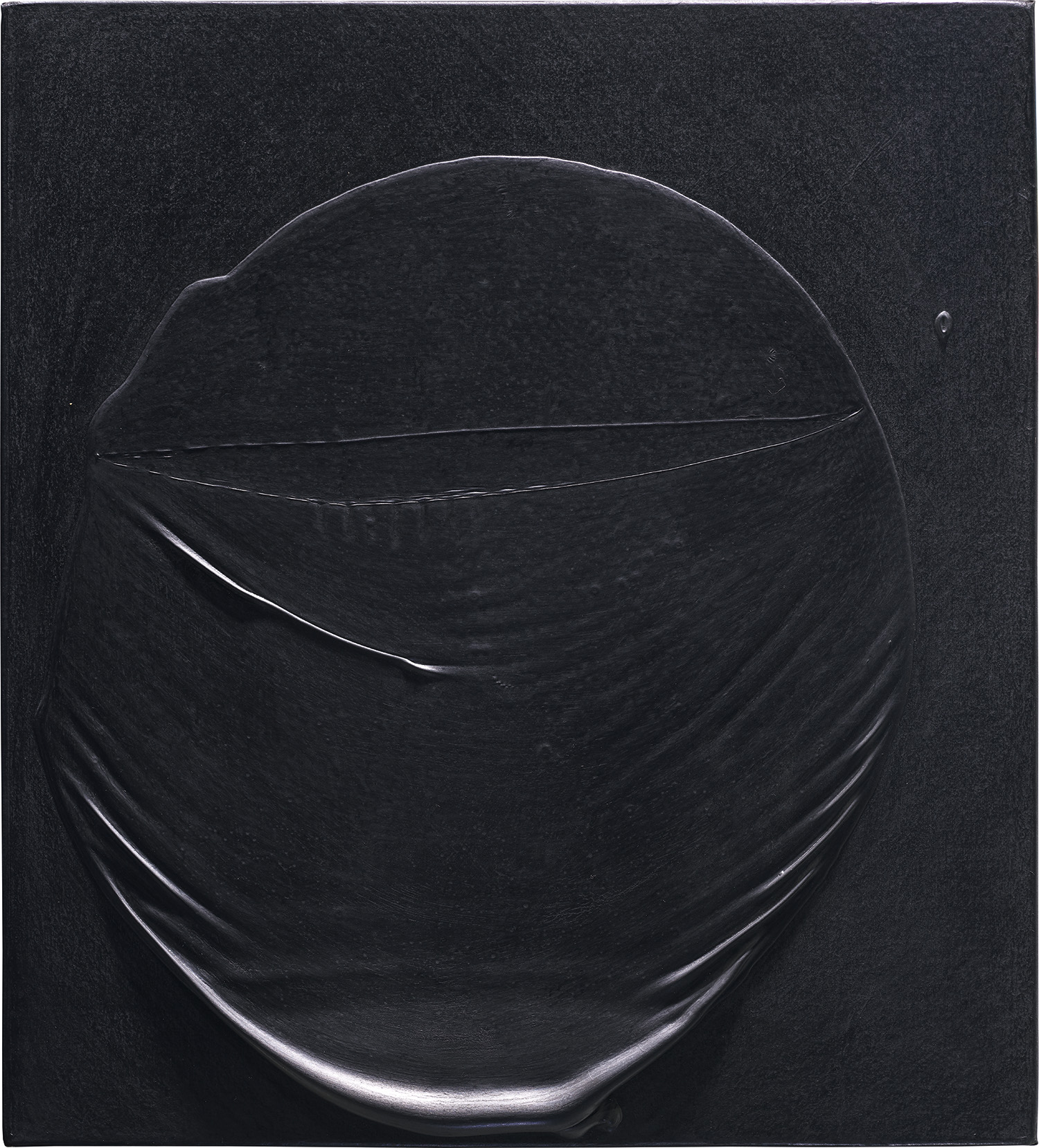 A mixed-media abstract composition combining vinyl, graphite, and acrylic on layered paper and canvas by Japanese artist Takesada Matsutani. The work explores geometric forms and material experimentation within a circular compositional framework.