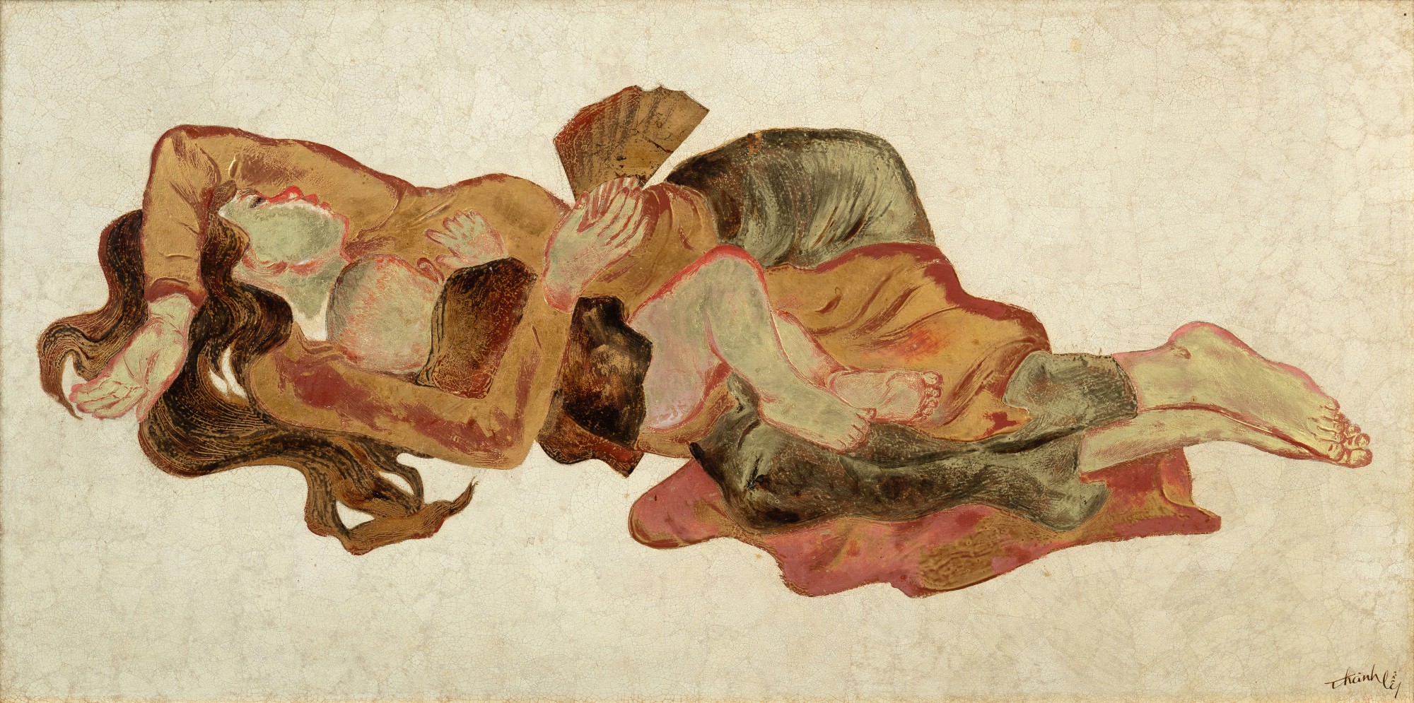 Created by Thanh Le studio in 1950, this work titled '午休' (Afternoon Rest) employs lacquer and eggshell on a wood panel. The piece exemplifies Vietnamese lacquerware tradition with its luxurious material and refined technique.