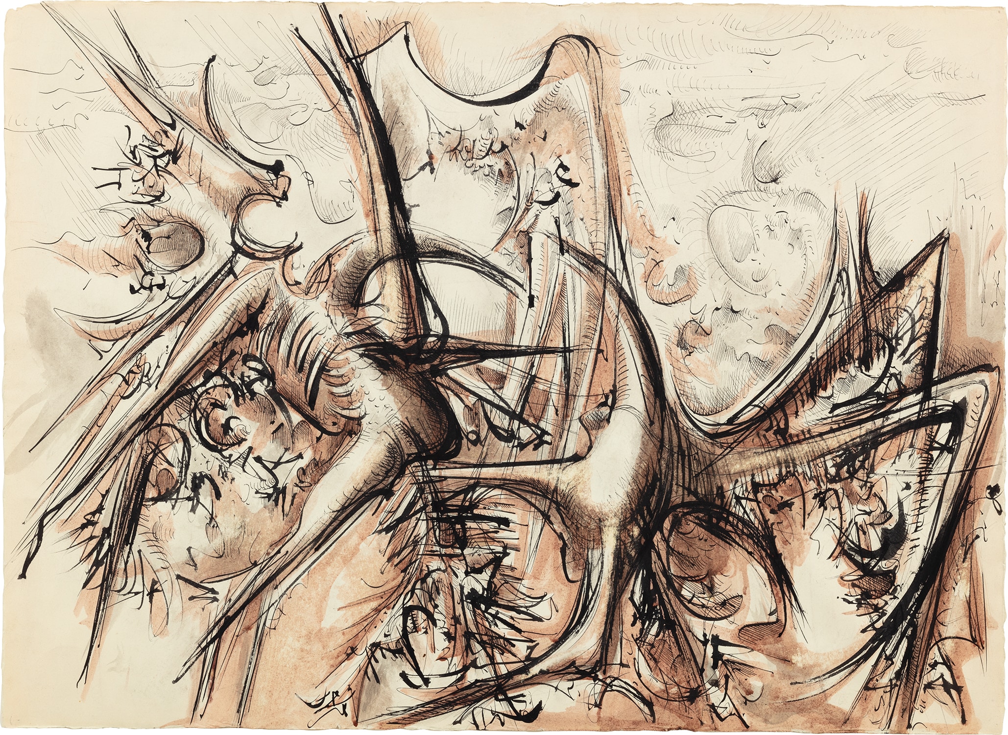 A black ink and watercolor drawing by sculptor Theodore Roszak on wove paper, presented in a frame. The work combines drawing and painting techniques in a mixed media approach.