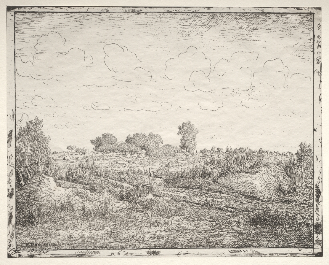 Created using the innovative cliché-verre technique, where drawings on glass plates were photographically printed onto paper, capturing the atmospheric effects of light across the landscape. As a leading member of the Barbizon School, Rousseau pioneered this hybrid medium that combined drawing with photographic processes.