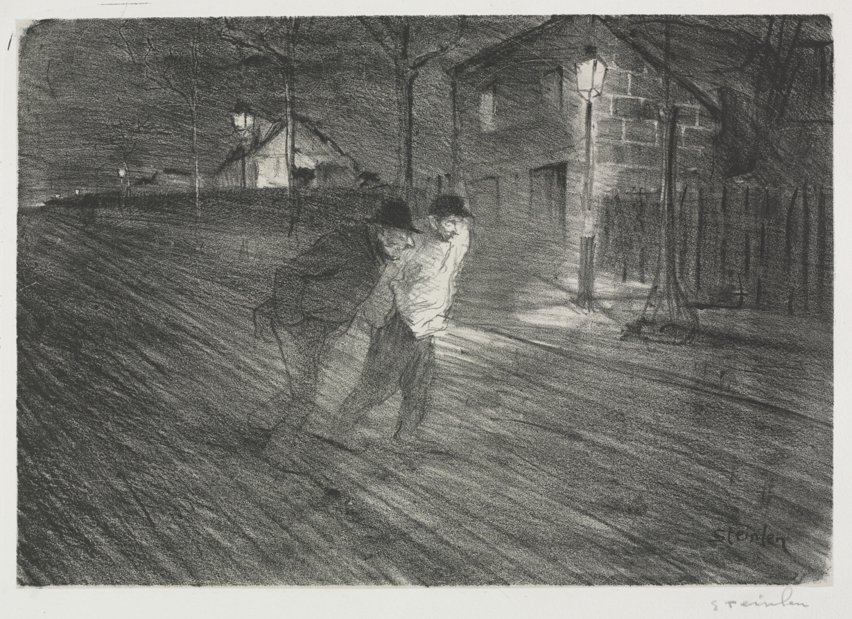 Documents a specific Montmartre street scene with the observational accuracy that made Steinlen the visual chronicler of fin-de-siècle Paris. His lithographic technique captures both architectural detail and the atmospheric quality of urban life.