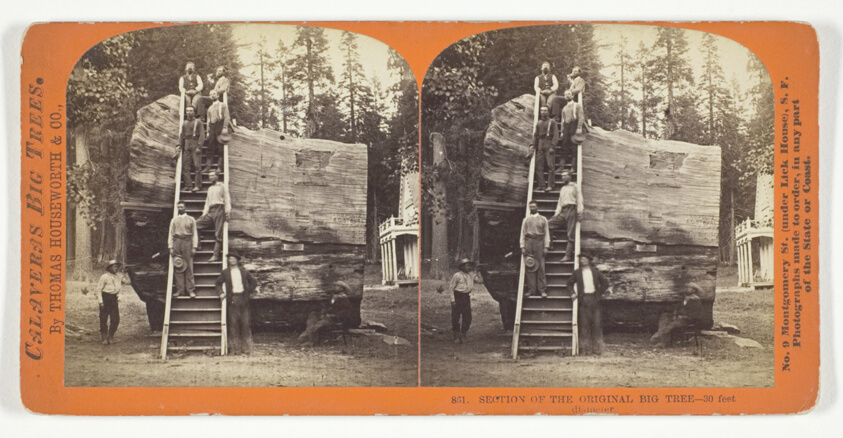 Featuring one of California's most famous natural attractions, this stereo photograph helped popularize tourism to the giant sequoia groves while documenting their impressive scale.