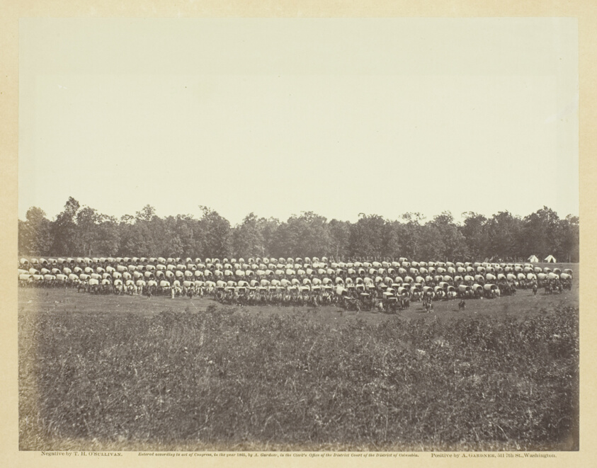 Documenting the massive logistical operations behind Civil War armies, this photograph reveals rows of supply wagons at a Union encampment during winter quarters. The systematic arrangement visible in the albumen print demonstrates the industrial scale of military organization that defined modern warfare.
