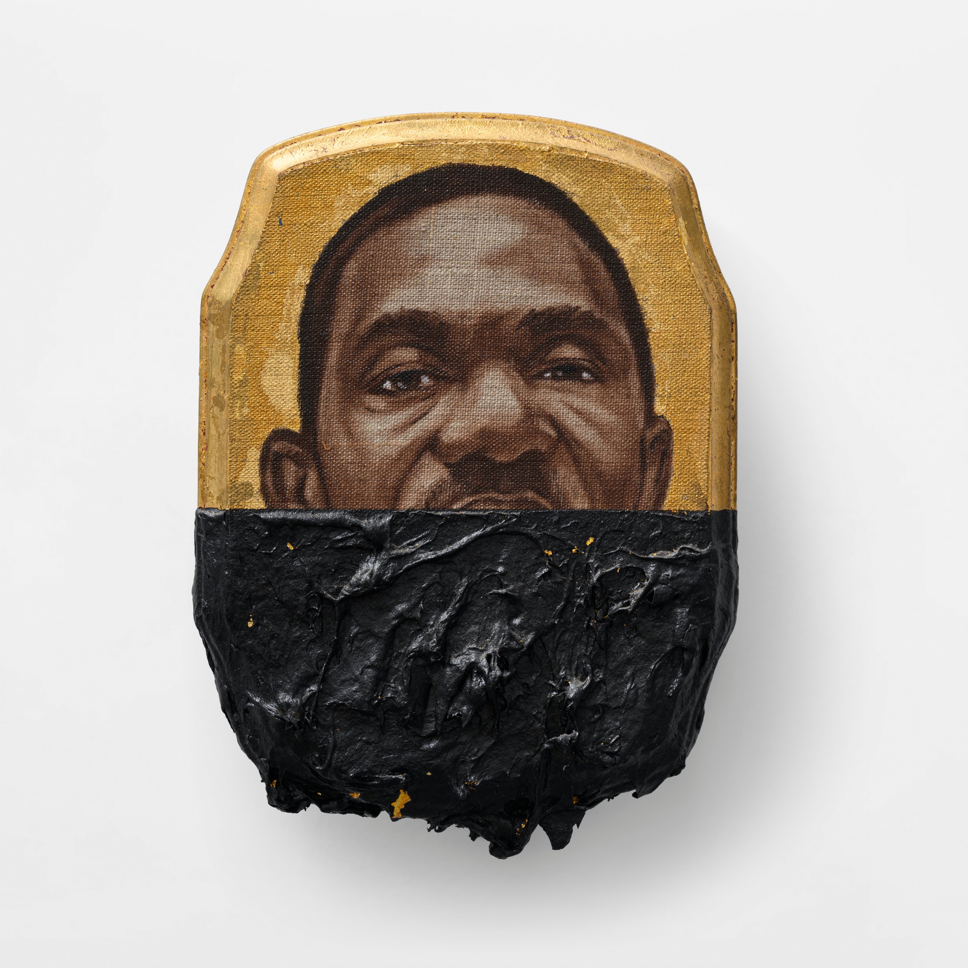 Jerome XXIV by Titus Kaphar is a striking 2014 work that combines oil paint, gold leaf, and tar on panel to create a tension between reverence and obscuration. The application of tar partially conceals the painted figure, evoking themes of erasure, hidden histories, and the marginalization of Black identity within the Western art canon. The use of gold leaf references the sacred traditions of religious iconography, juxtaposing spiritual dignity against the suffocating darkness of the tar.