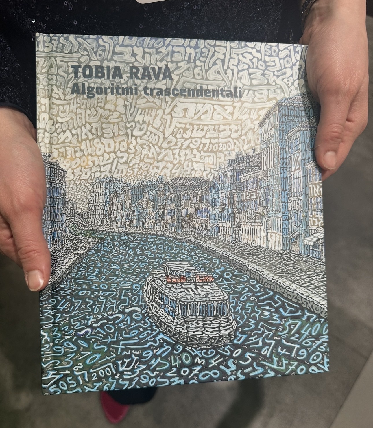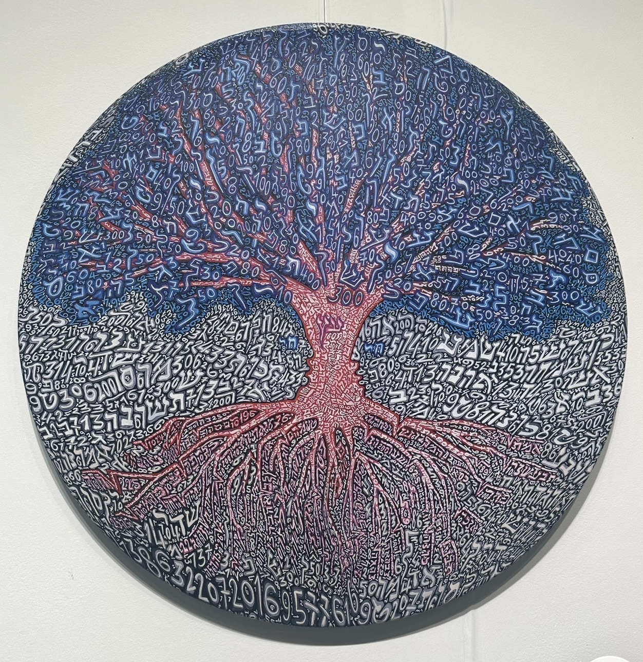 This circular mixed media work by Italian artist Tobia Rava features his signature exploration of numbers and mathematical symbols, creating a radiating tree-like composition. The piece displays Rava's characteristic use of dense numerical typography, with digits and figures rendered in a palette of blues, pinks, and whites that emanate from a central glowing core. The work exemplifies Rava's decades-long investigation into the intersection of mathematics, mysticism, and visual art, creating a mesmerizing cosmic landscape from alphanumeric elements.