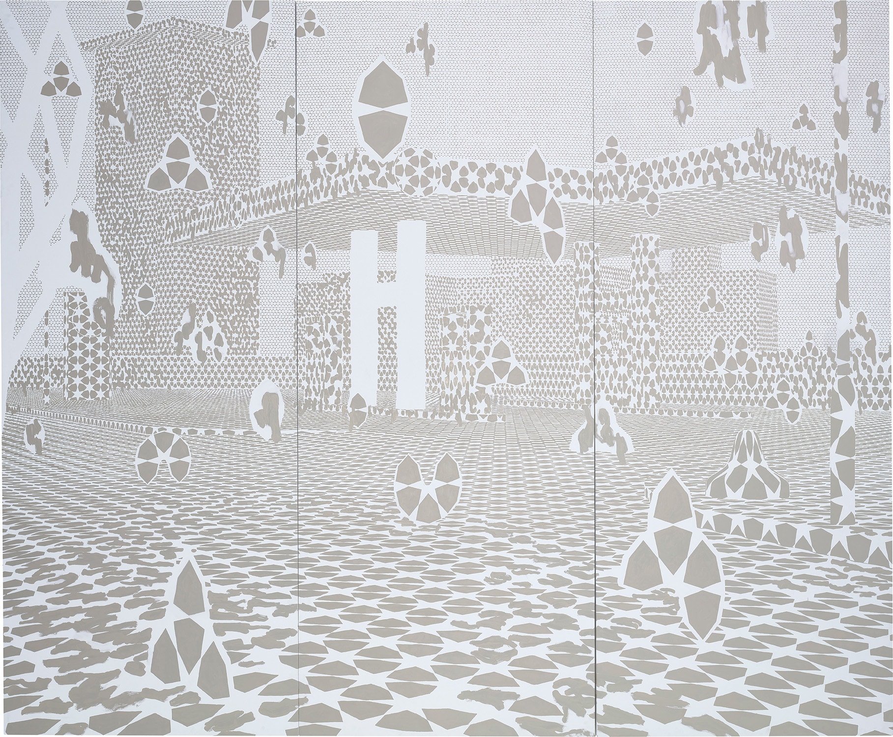 Toby Ziegler's 'Enter Desire' is a triptych created in 2005 using oil on Scotchlite, a reflective material that creates an interactive visual experience. The three-part composition engages with concepts of desire and perception through its luminous surface quality.