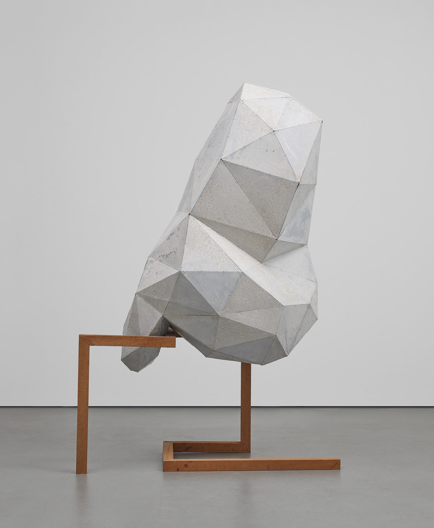 A contemporary mixed media sculpture by Toby Ziegler combining oxidised aluminium and wood materials. The work exemplifies the artist's interest in found objects and industrial materials.