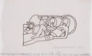 Tom Wesselmann's "Drawing for Two Nudes" is a modest pen and ink study on tracing paper created in 1977, measuring just 2 3/4 by 4 1/2 inches. The work exemplifies the artist's characteristic exploration of the female form through a spare, linear approach that prioritizes gesture and simplified contours over detailed modeling. This preparatory drawing reflects Wesselmann's broader practice of reducing figurative subjects to their essential elements while maintaining an intimate scale appropriate to the medium of tracing paper.
