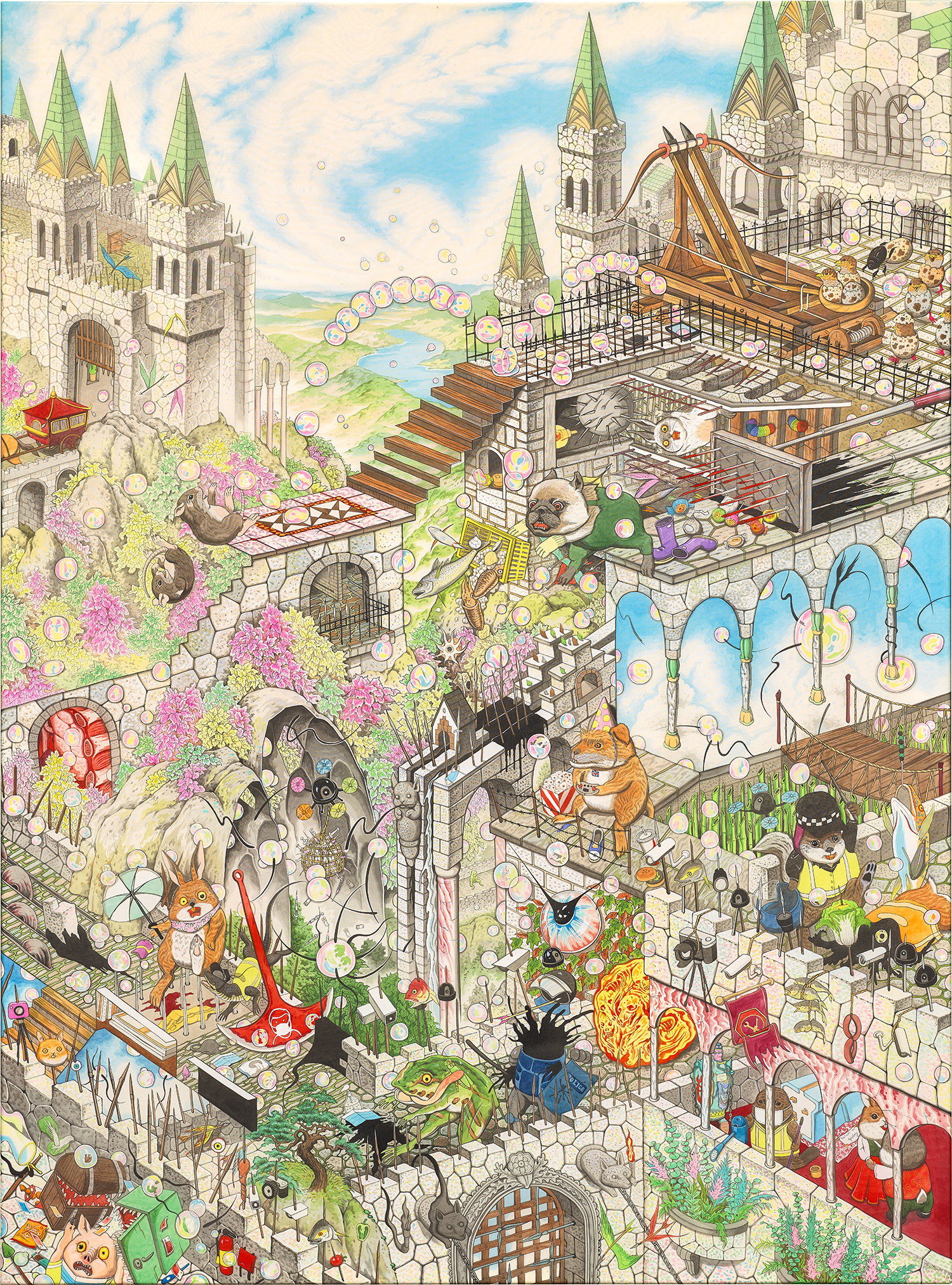 "Uh oh, Together Again" by Tomokazu Matsuyama is a dynamic and visually layered work that masterfully collides Eastern and Western visual traditions through bold graphic forms, fluid brushwork, and vibrant color. The composition weaves together figurative elements and abstract patterns, reflecting the artist's bicultural identity as both Japanese and American. Created with acrylic and mixed media on canvas in 2018, the painting pulses with energy and tension, embodying themes of cultural hybridity, identity, and the complex dialogue between tradition and modernity.